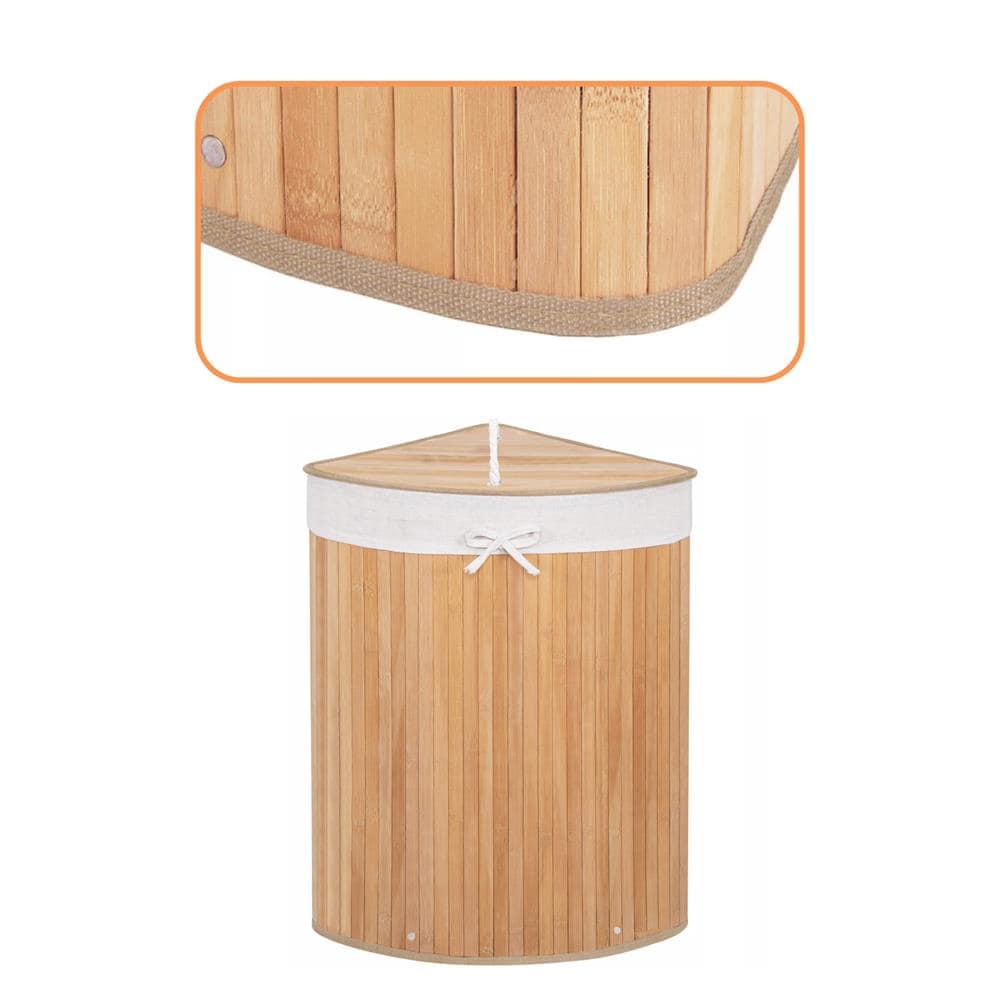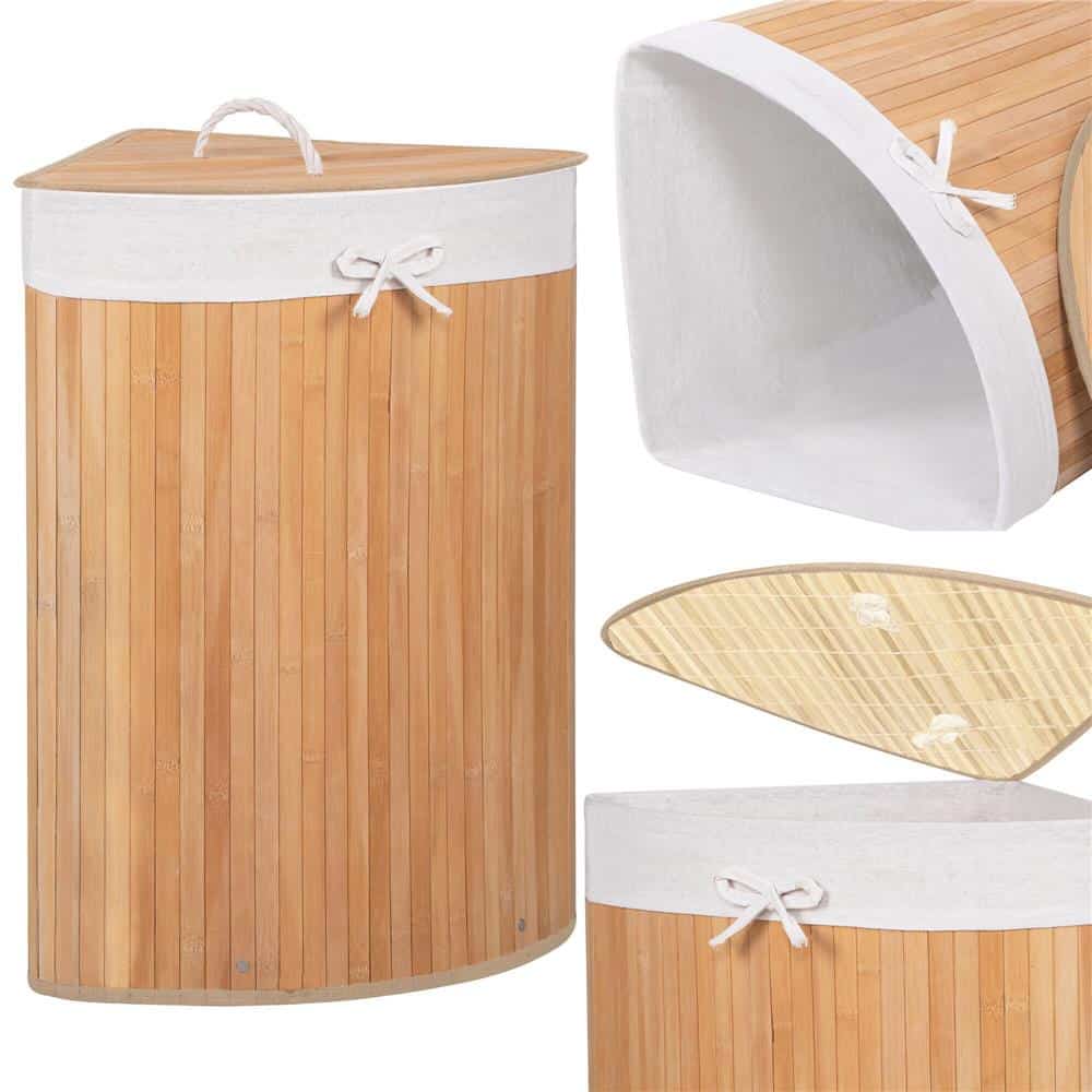Cos de rufe triunghiular pentru colt cu capac, bambus si sac textil detasabil, 60 litri, 55x35x60 cm, maro natur Mob360