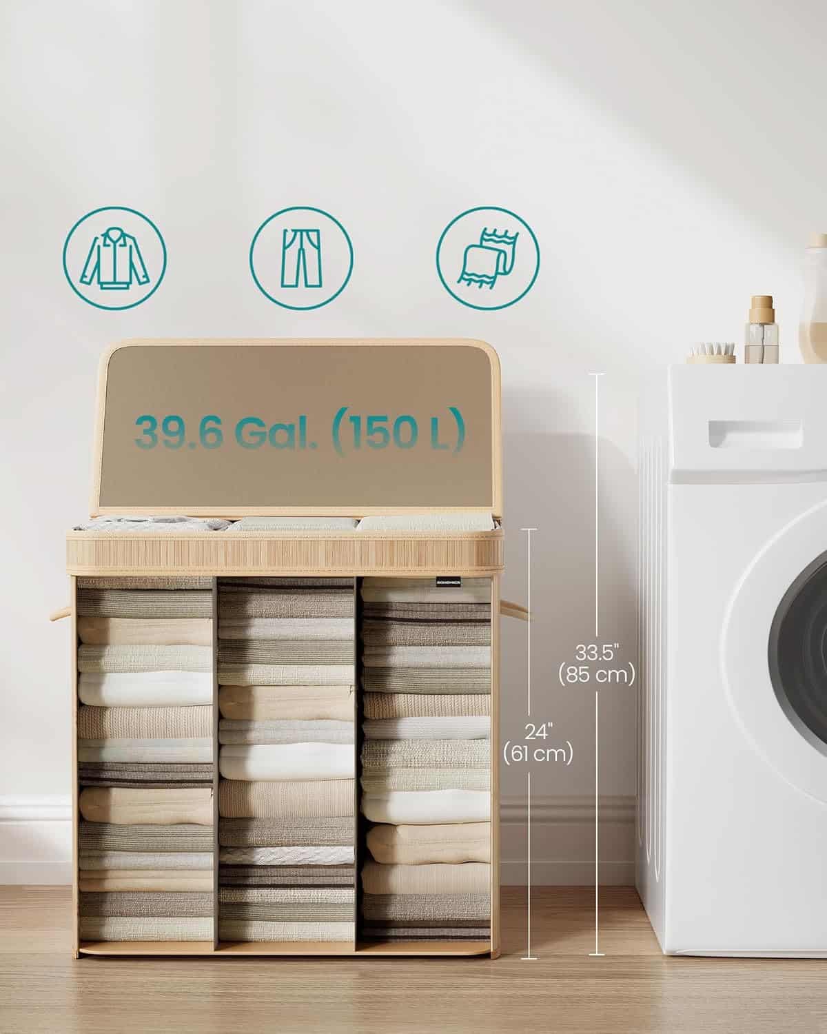 Cos rufe 63x42x61 cm, 150L, pliabil cu capac si sac lavabil, bambus si textil, bej natur Mob360 – produs disponibil în magazinul Mob360.
