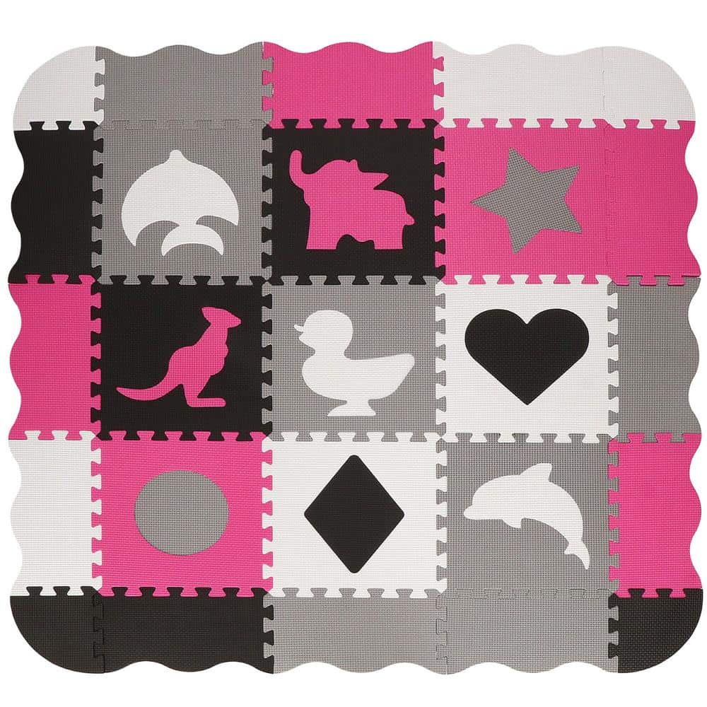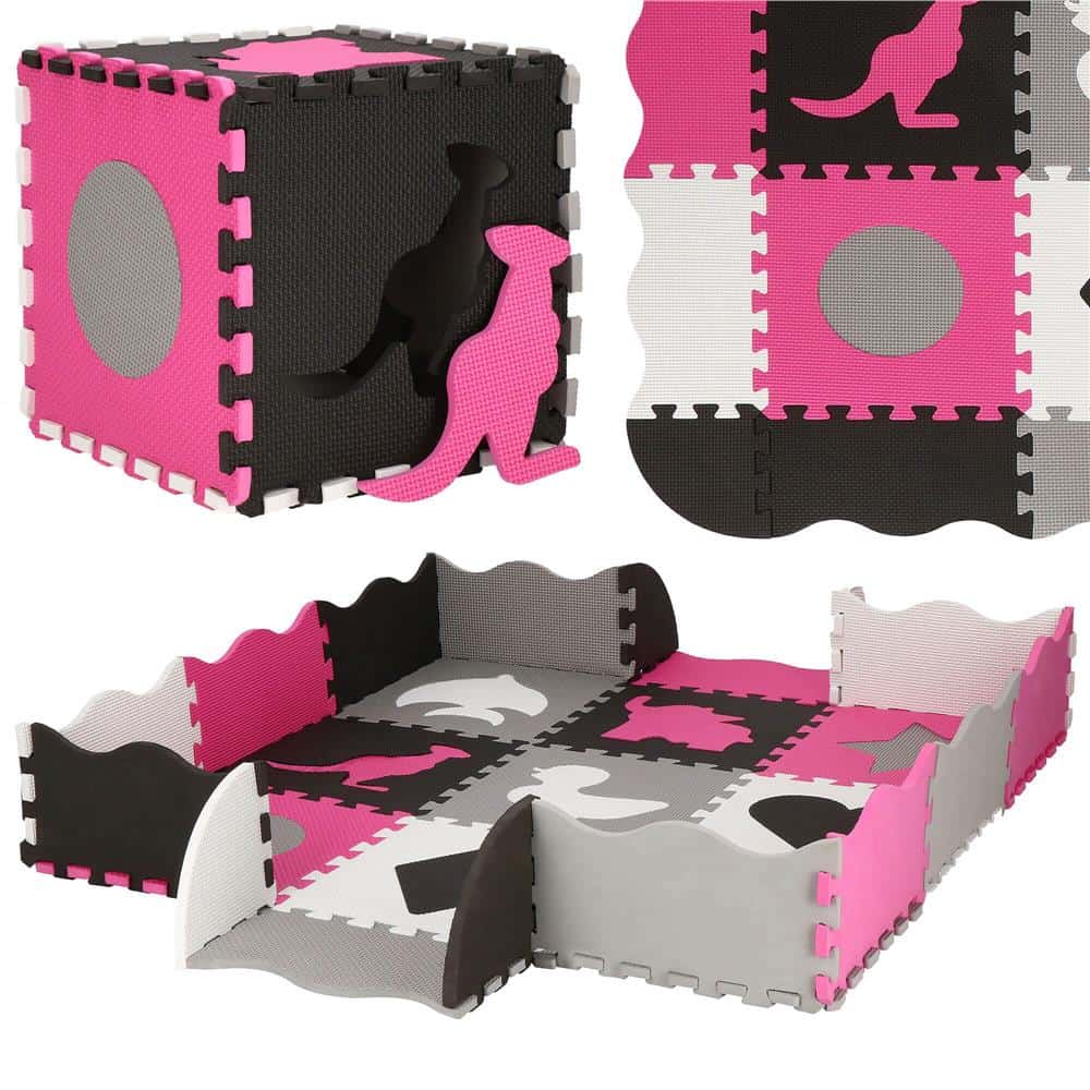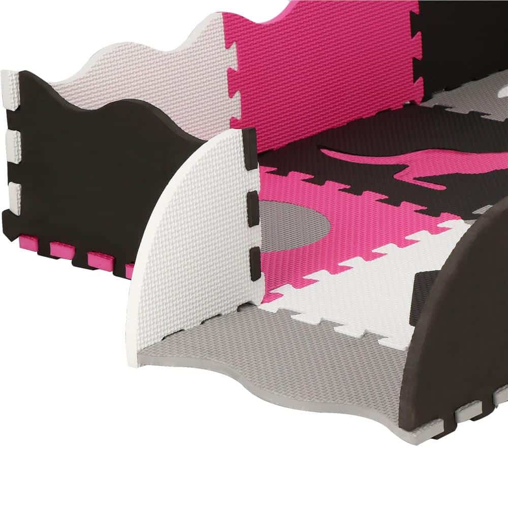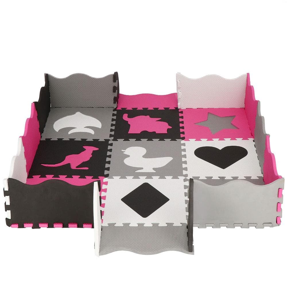 Covor din spuma pentru copii, tip puzzle forme, 34 piese, termoizolant, 120×120 cm, gri roz Mob360