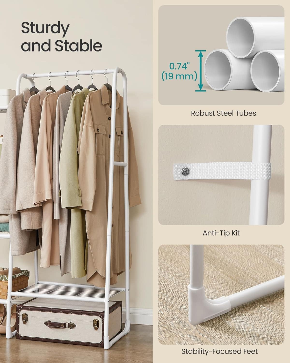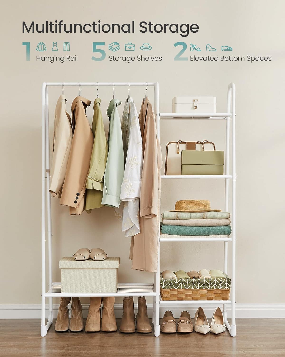 - Cuierul metalic combina o bara pentru umerase cu 5 rafturi deschise, oferind spatiu generos pentru organizarea hainelor si accesoriilor intr-un singur loc. Designul deschis permite acces rapid la obiecte si este ideal pentru dormitor, hol sau dressing. Structura din otel rezistent sustine pana la 25 kg pe bara de haine si pana la 70 kg in total. Inaltimea generoasa permite agatarea paltoanelor lungi, iar rafturile sunt potrivite pentru pantofi, cutii sau genti. Caracteristici principale: