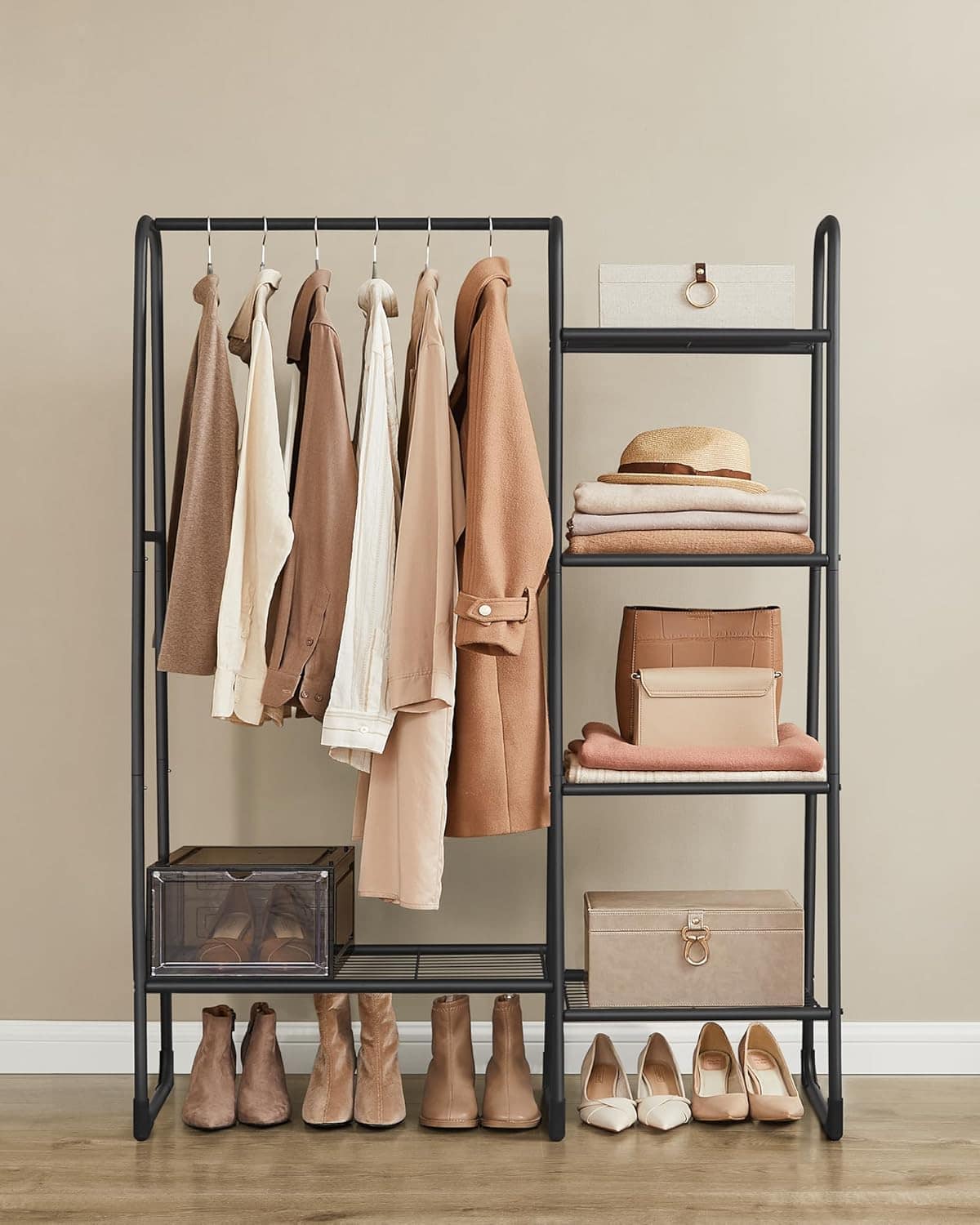 - Organizeaza eficient hainele si accesoriile cu acest suport multifunctional, ideal pentru dormitor sau hol. Combina bara pentru umerase cu rafturi practice, oferind spatiu optim pentru depozitare. Caracteristici principale: