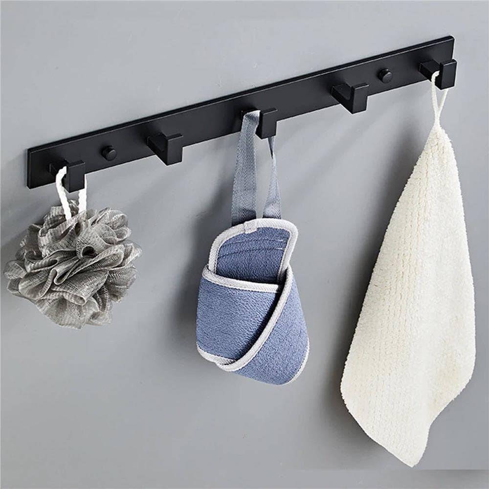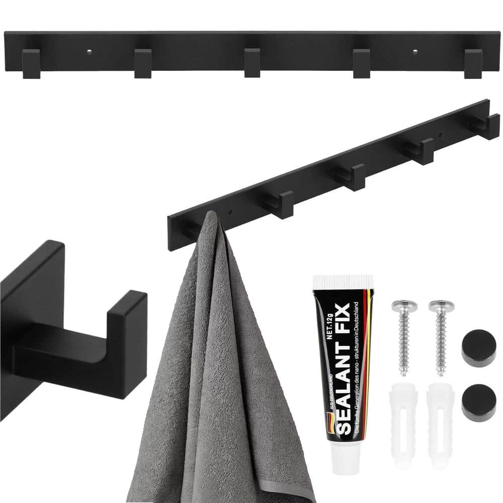 Cuier de baie pentru prosoape cu 2 sisteme instalare, aluminiu, 5 agatatori, 45x4cm, negru Mob360 – produs disponibil în magazinul Mob360.