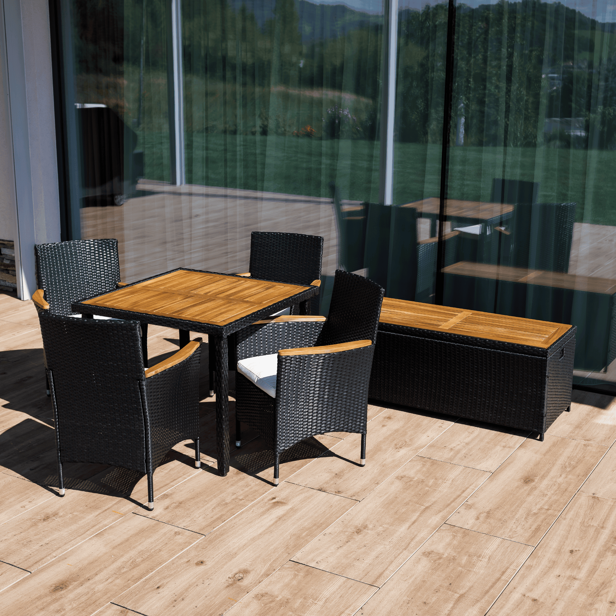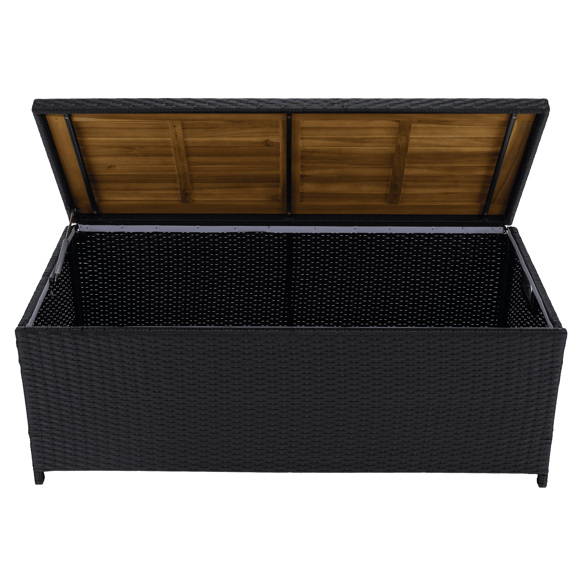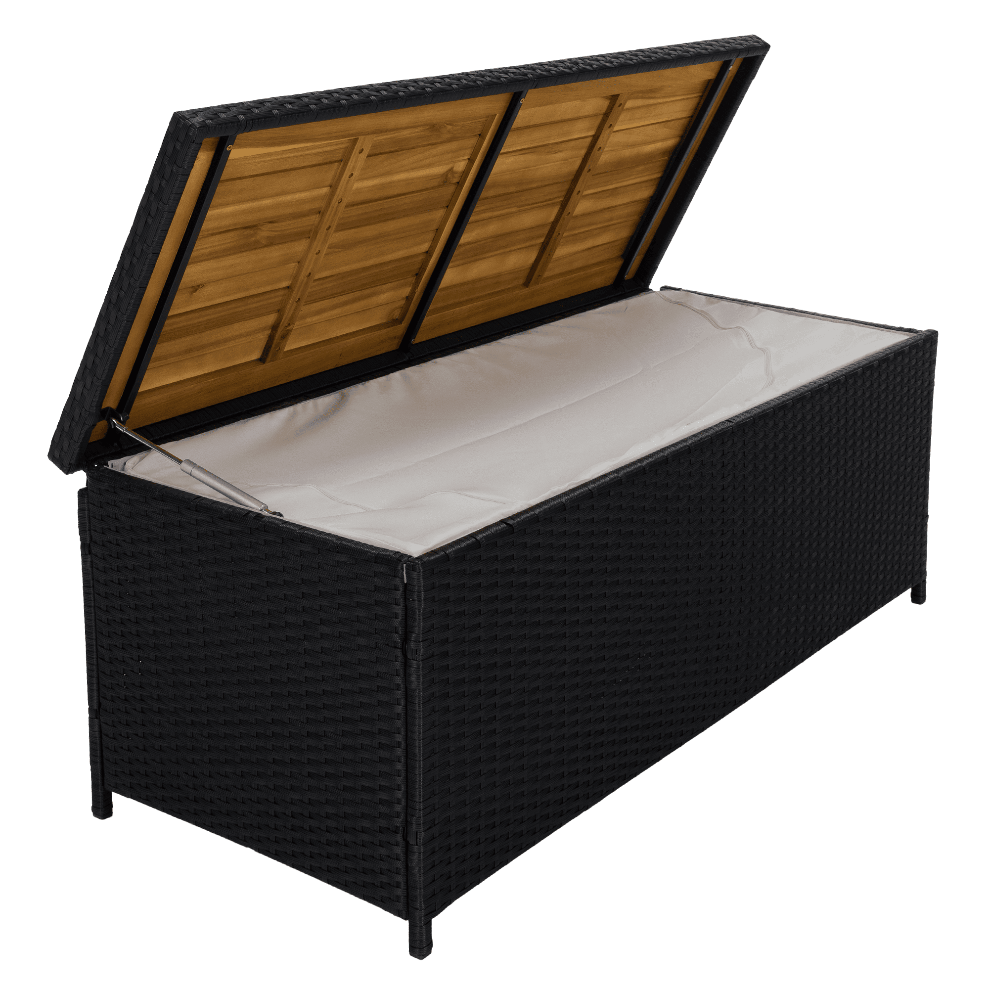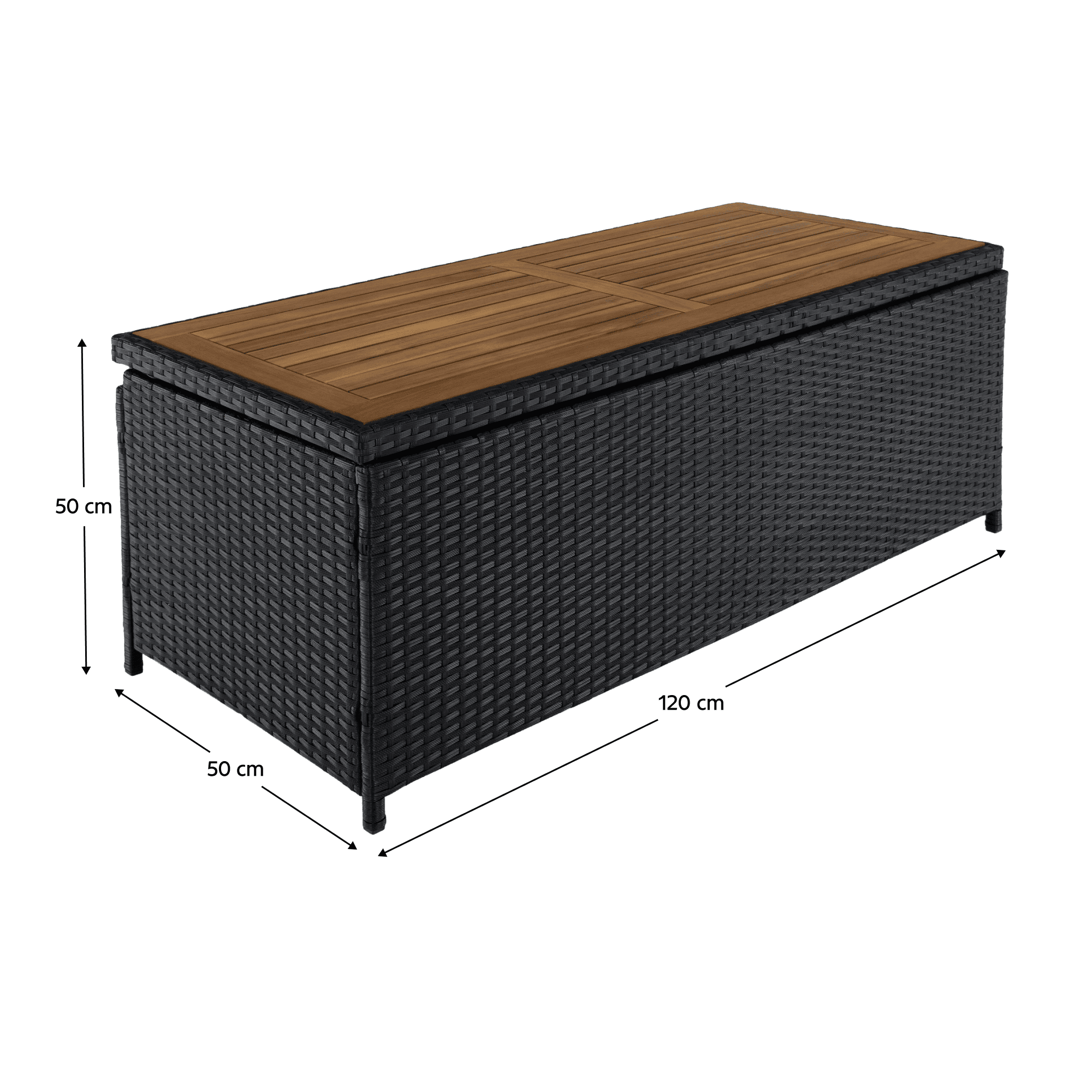 Material: ratan tehnic/lemn masiv de salcâm/oţel/ţesătură Culoare: negru/natural/crem Dimensiuni (lxAxh): 120x50x50 cm Înălţimea părţii de şezut: 50 cm, Adâncime părţii de şezut: 50 cm Lăţime părţii de şezut: 120 cm Portanţă: 100 kg Greutate: 13,2 kg Potrivită pentru exterior Rezistent la intemperii Vă recomandăm să protejaţi produsul de condiţiile meteorologice dificile pentru a prelungi durata de viaţă a produsului Deschiderea este asigurată de un piston hidraulic Potrivită pentru unelte de grădină, jucării, perne, pături Cutia poate servi şi ca bancă Sac impermeabil cu fermoar Utilizare versatilă Design modern Design natural Livrat în formă dezasamblată