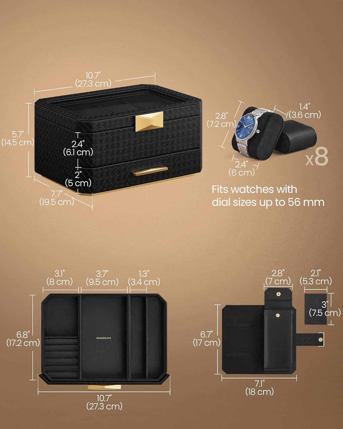 Cutie ceasuri Ronne Collection, 8 sloturi cu compartimente, piele PU impletita, 27x20x15 cm, negru Mob360