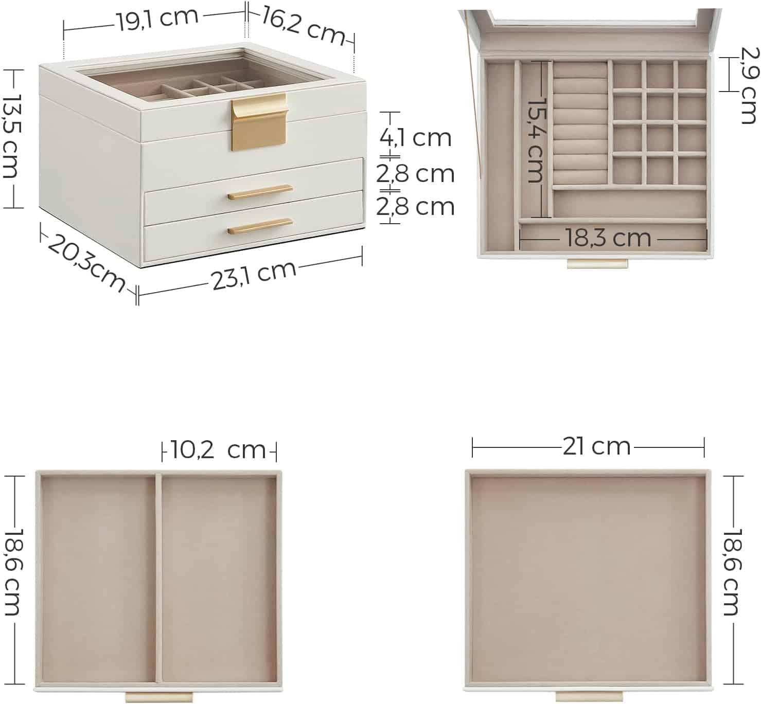 Cutie de bijuterii cu 3 nivele, 2 sertare, capac din sticla, 20x23x14cm, alb si auriu Mob360