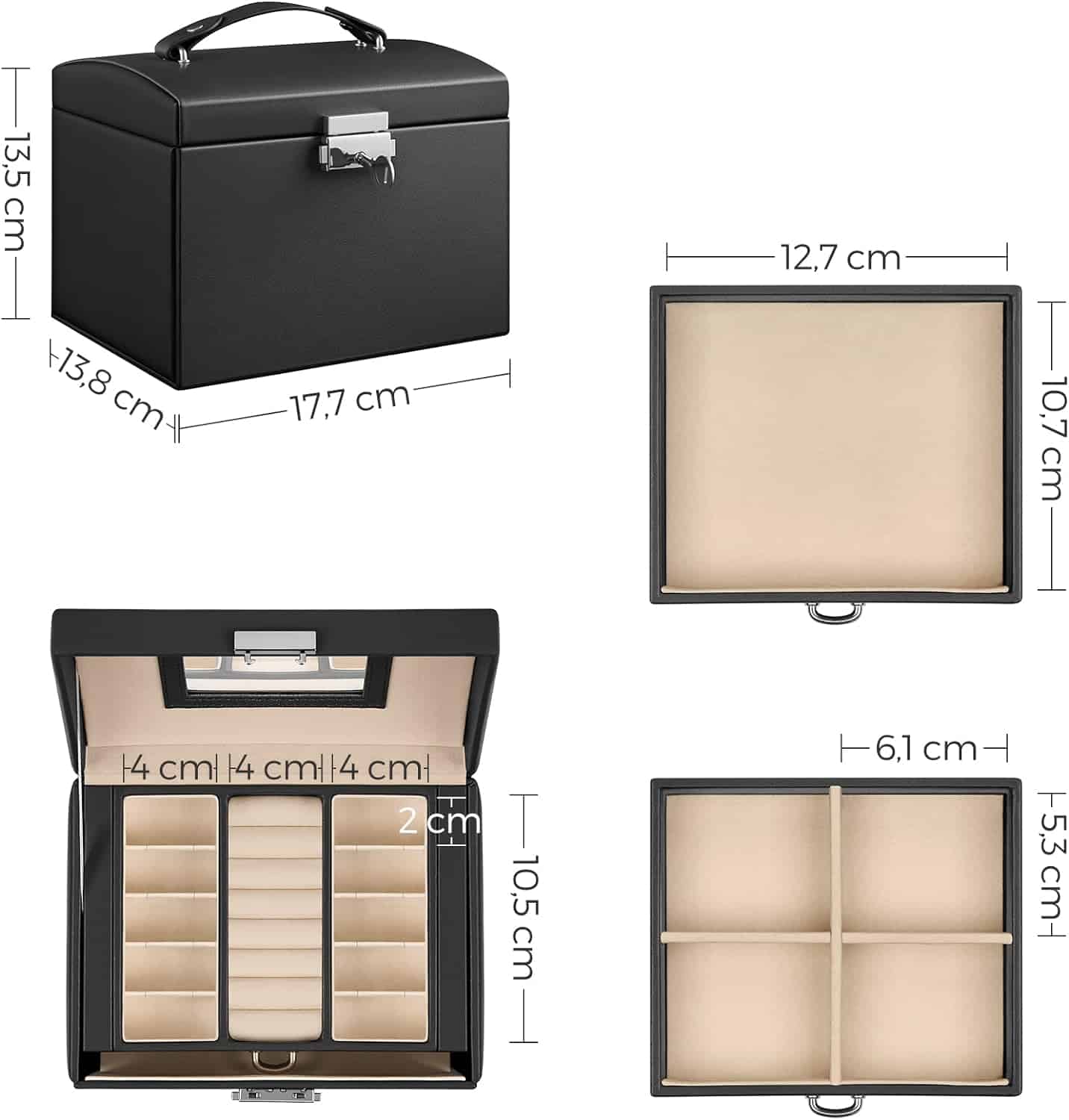 Se mandreste cu multiple carlige pentru coliere pe ambele parti si 3 niveluri de depozitare cu o multime de compartimente diferite.Organizatorul de bijuterii se blocheaza cu 2 chei pentru a va pastra piesele pretioase in siguranta; datorita manerului din partea de sus, caseta mica de bijuterii este portabila pentru utilizare in calatorii. Suprafata din piele sintetica de calitate, corpul din MDF solid si cusaturile ingrijite alcatuiesc o cutie de bijuterii de calatorie solida si durabila, care va va tine companie multi ani de acum inainte.
