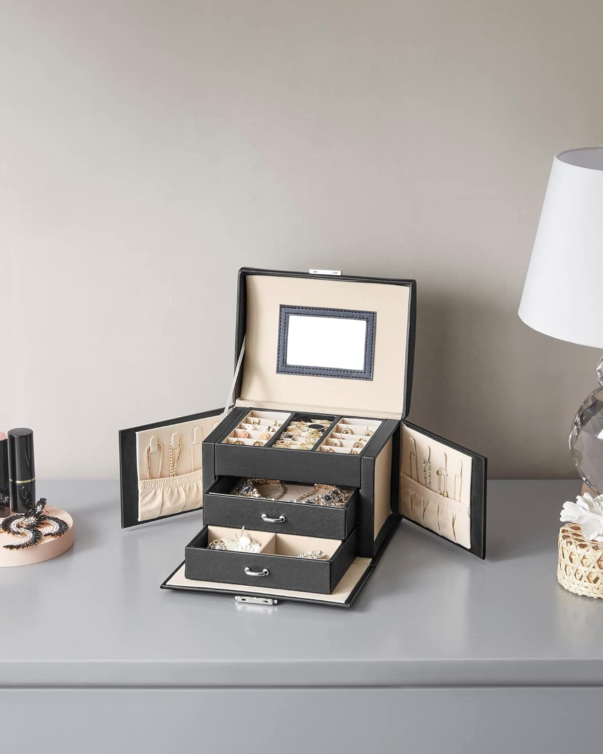 Cutie de bijuterii cu 3 nivele, 2 sertare, oglinda si incuietoare, 14x18x14cm, negru Mob360