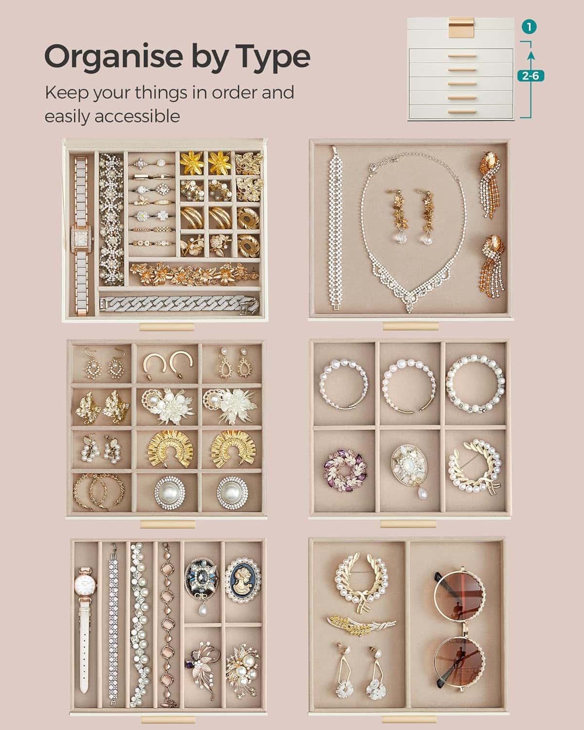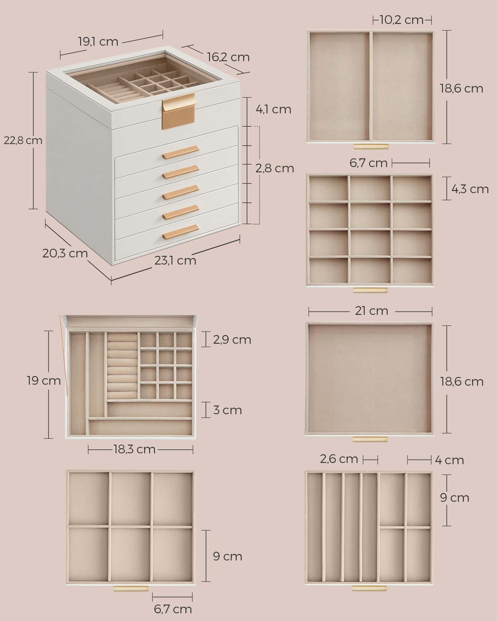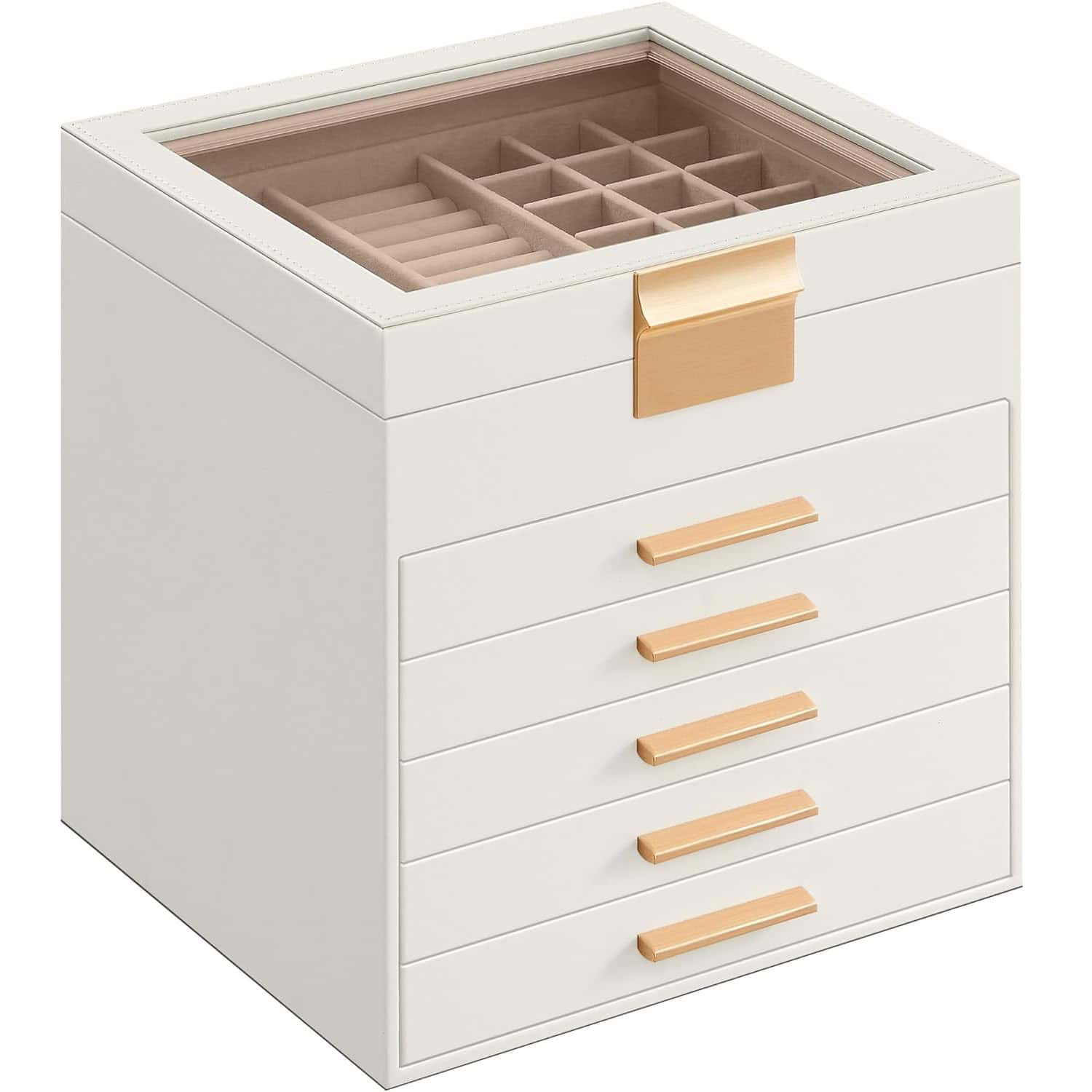 Cutie de bijuterii cu 6 nivele, 45 compartimente, capac sticla, 20x23x23 cm, alb Mob360