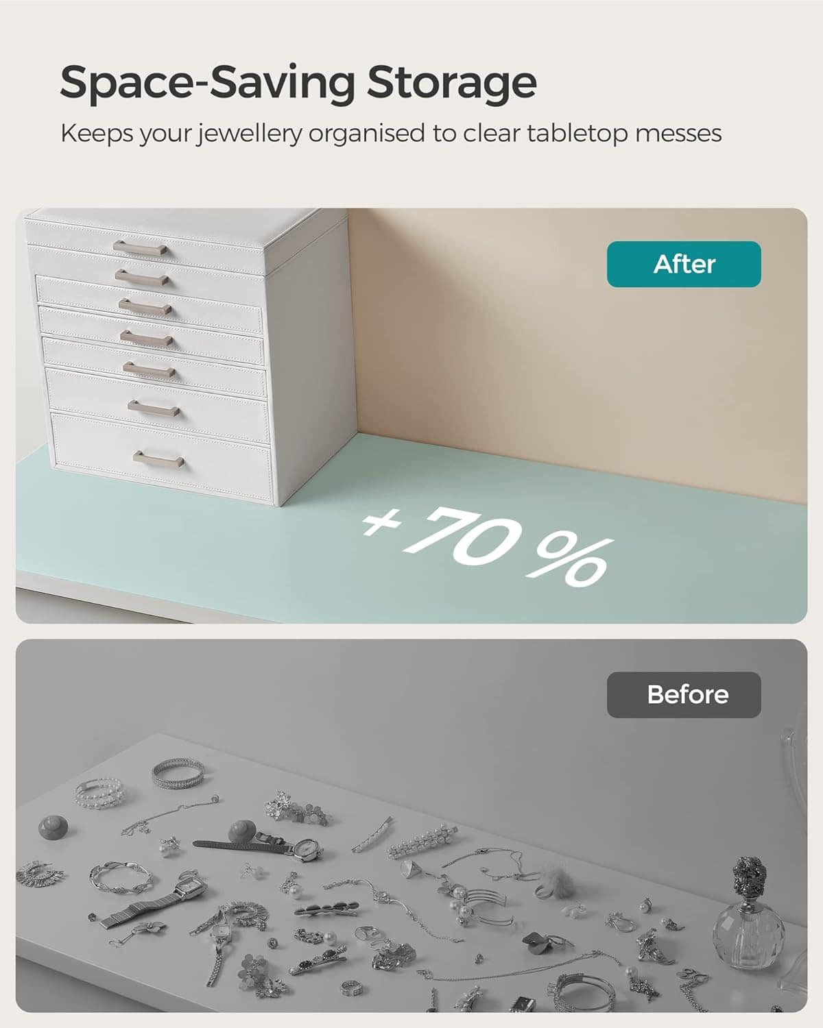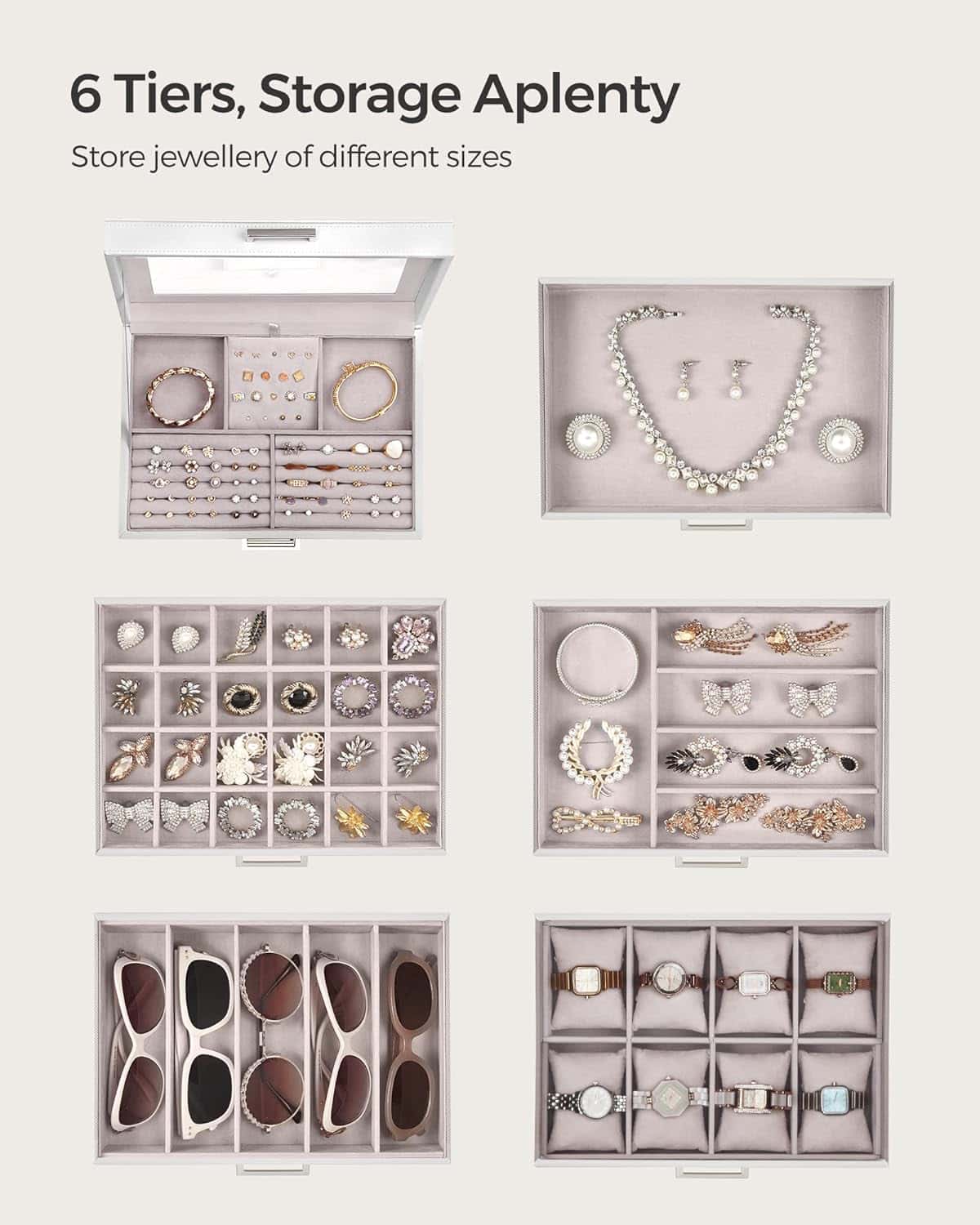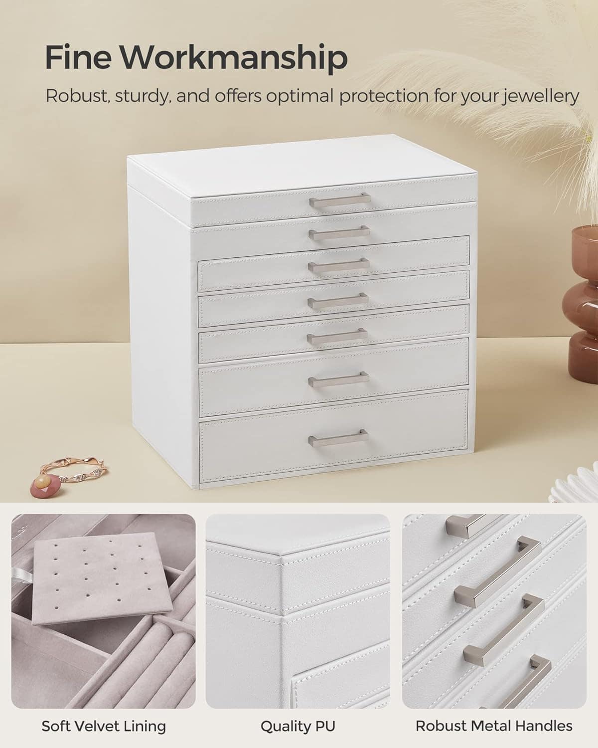 Detalii despre produs: Culoare: alb. Dimensiuni (L x H x P): 30,5 x 31,5 x 21,5 cm. Dimensiuni sertar (2,4. niveluri): 28,5×3,2×19,5 cm. Dimensiuni sertar (5. nivele) 28,5×4,5×19,5 cm (L x H x P). Dimensiuni sertar (6. niveluri) 28,5×6,5×19,5 cm. Dimensiunile compartimentului cu 6. niveluri (L x H x P): 6,5 x 4 x 9,5 cm. Material: Panou MDF + PU si catifea. Greutate neta: 4,48 kg. Despre acest articol Aceasta vitrina pentru bijuterii are 6 nivele spatioase pentru a le organiza si a le pregati pentru a le purta.Datorita diferitelor compartimente, bratarile, cerceii, colierele, inelele, ceasurile si chiar si ochelarii de soare vor fi toate la locul lor in aceasta cutie de bijuterii.Va veti bucura sa constatati ca opritorul impiedica sertarul sa cada dupa ce il deschideti in graba. In plus, rama rezistenta din MDF si captuseala catifelata va protejeaza bijuteriile de lovituri si zgarieturi, astfel incat acestea vor straluci mereu.Designul minimalist, pielea sintetica alba si manerele din metal stralucitor fac din acest organizator de bijuterii o piesa pur si simplu eleganta.