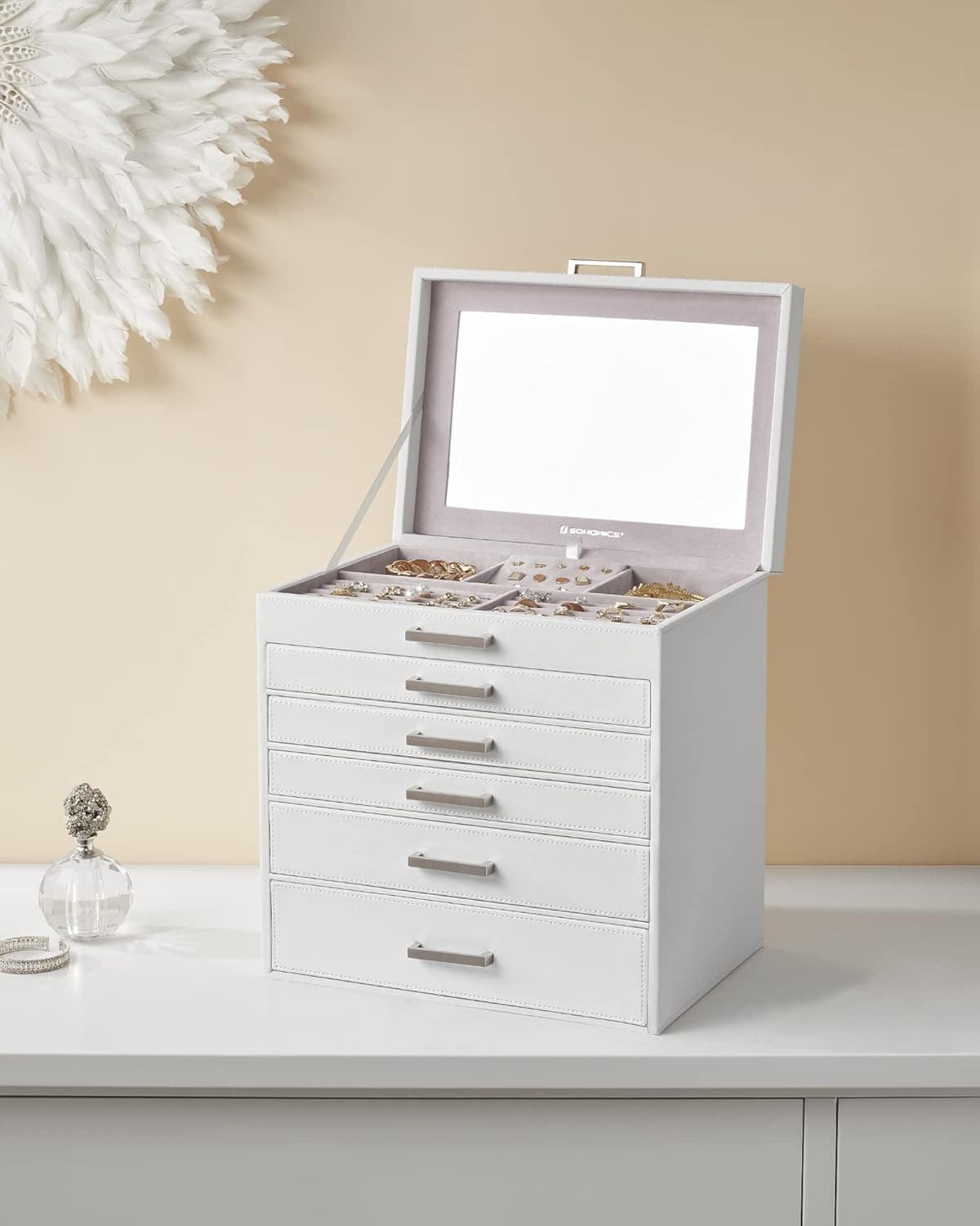 Cutie de bijuterii din MDF cu 6 nivele, 5 sertare, cu oglinda 31x32x22cm, alb Mob360 – produs disponibil în magazinul Mob360.
