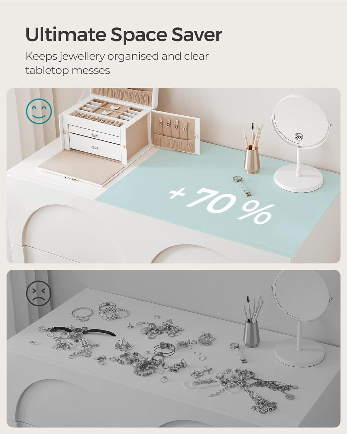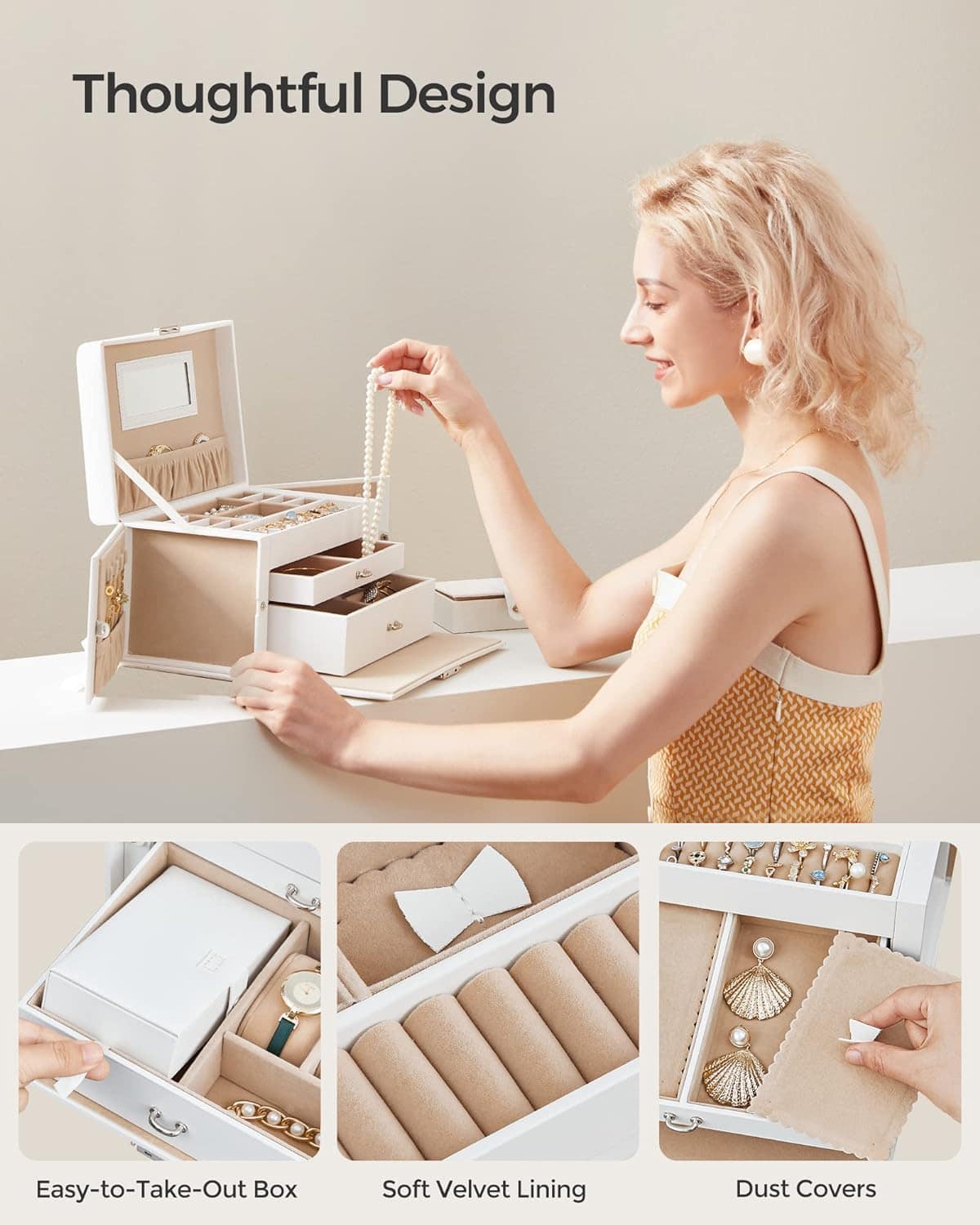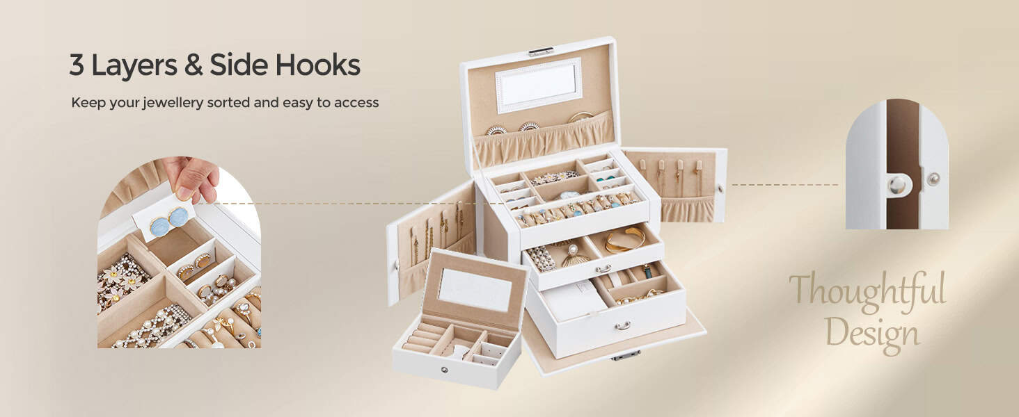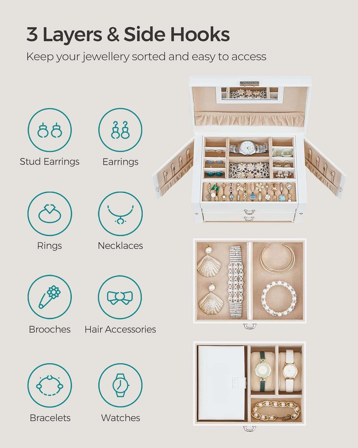 Compartimente separate, buzunare de catifea, deschideri pentru cercei cu stifturi, fante pentru inele, perne pentru ceasuri, carlige laterale pentru agatarea colierelor fara incurcaturi — aceasta cutie de bijuterii cu 3 niveluri ofera spatiu de depozitare pentru diversele tale bijuterii.