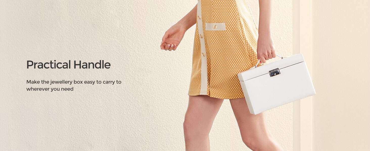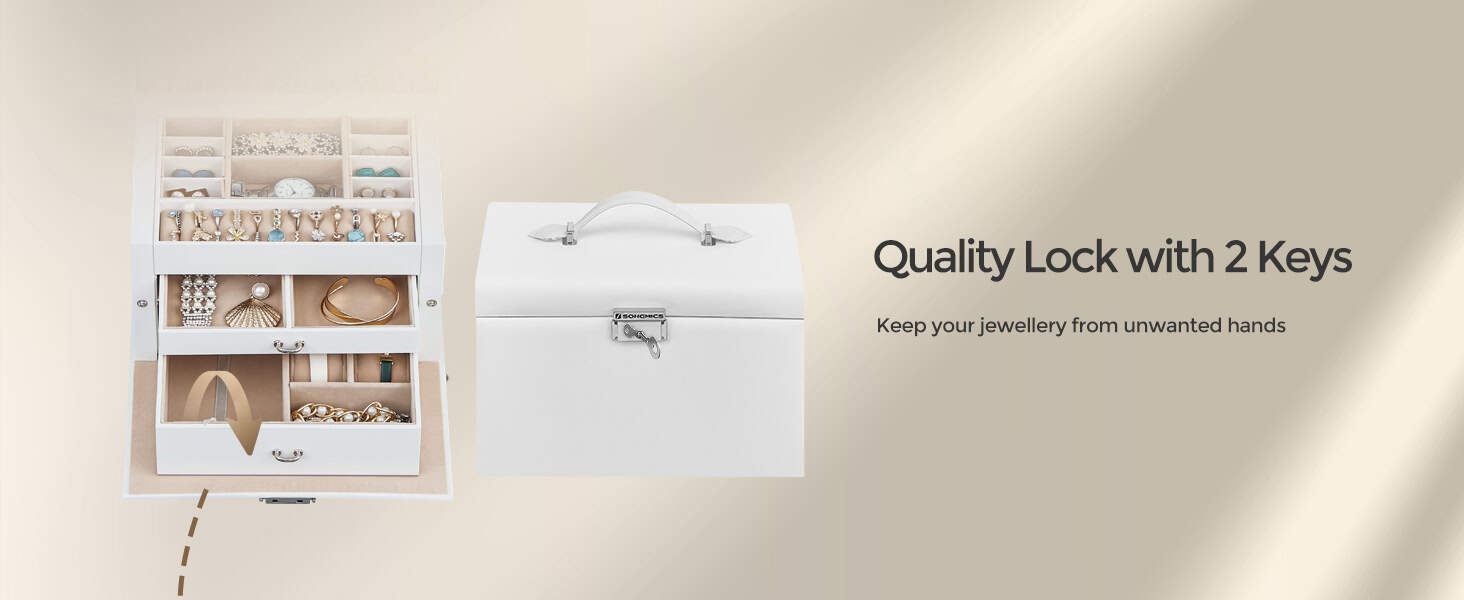 Lacat si maner practice: Aceasta cutie de bijuterii se incuie cu 2 chei pentru a va pastra obiectele de valoare in siguranta si la indemana; manerul de pe capac va permite sa transportati cu usurinta cutia de bijuterii oriunde doriti.