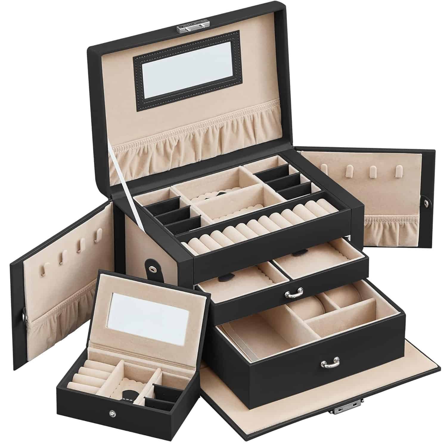Cutie de bijuterii pe 3 nivele, cu 2 sertare, oglinda, maner, inchidere cu cheie, 18x26x17cm, negru Mob360