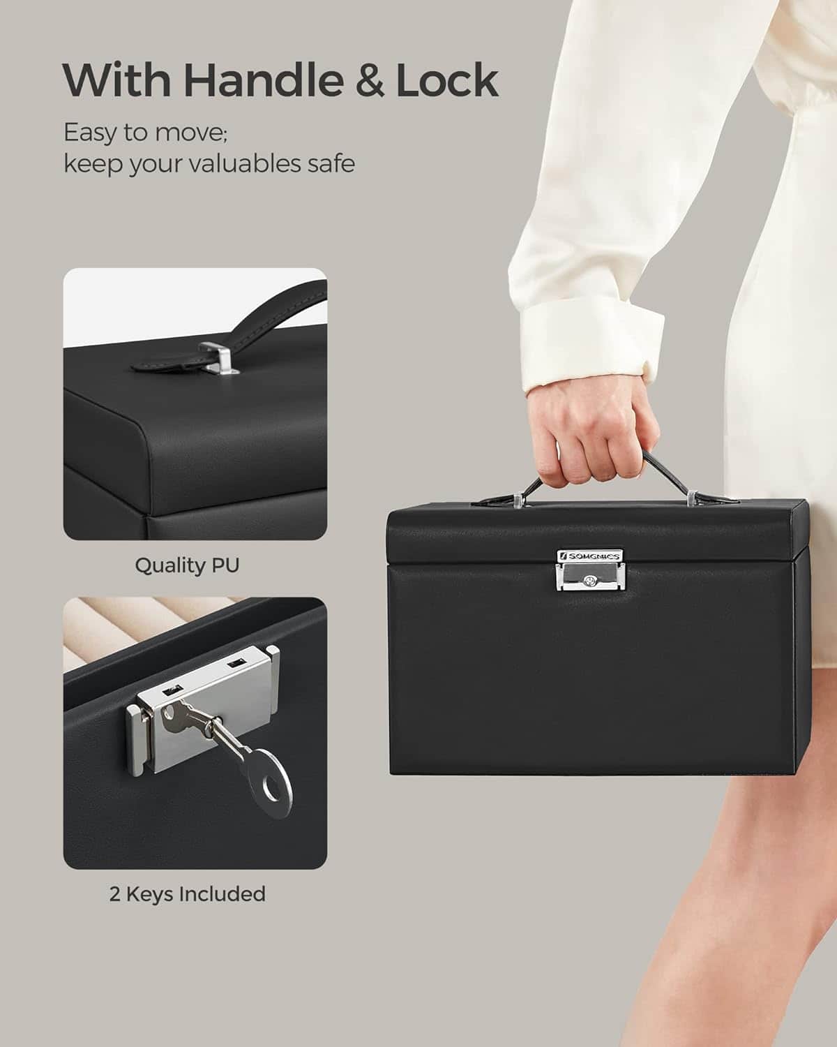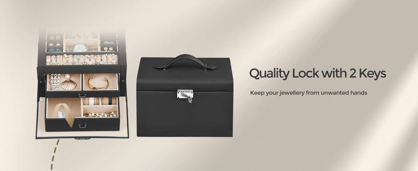 Lacat si maner practice: Aceasta cutie de bijuterii se incuie cu 2 chei pentru a va pastra obiectele de valoare in siguranta si la indemana; manerul de pe capac va permite sa transportati cu usurinta cutia de bijuterii oriunde doriti.