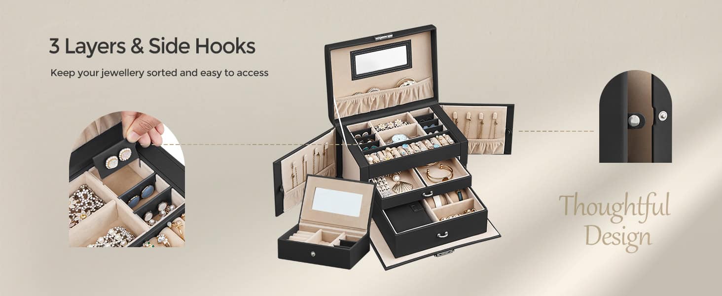Compartimente separate, buzunare de catifea, deschideri pentru cercei cu stifturi, fante pentru inele, perne pentru ceasuri, carlige laterale pentru agatarea colierelor fara incurcaturi — aceasta cutie de bijuterii cu 3 niveluri ofera spatiu de depozitare pentru diversele tale bijuterii.
