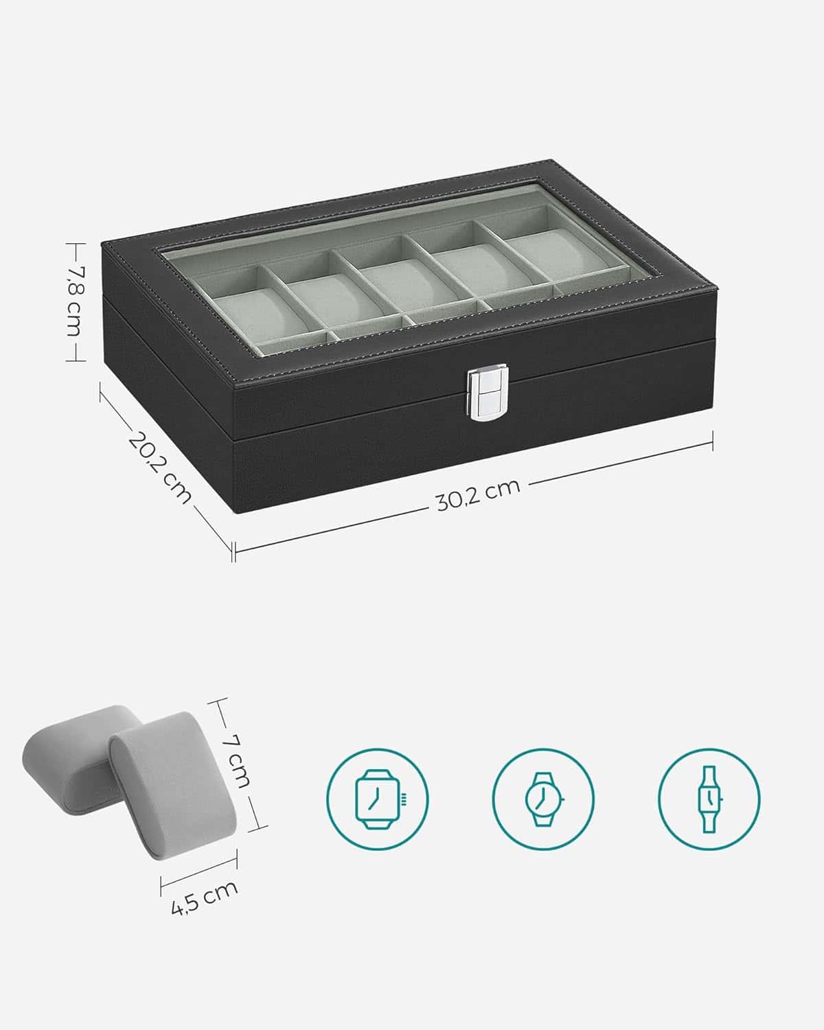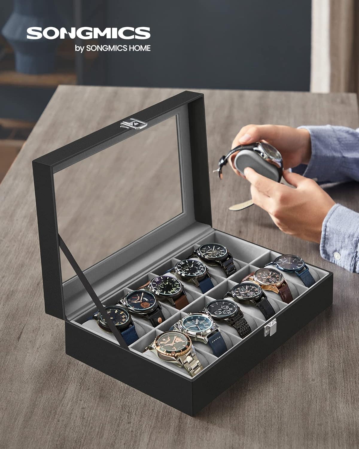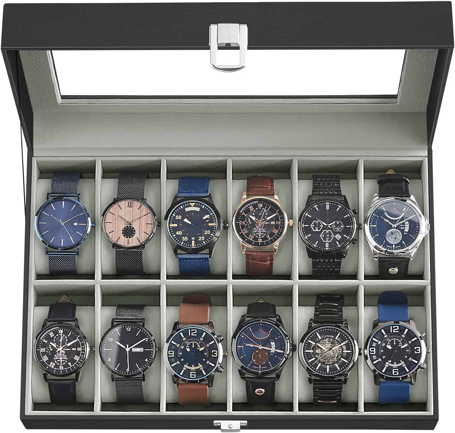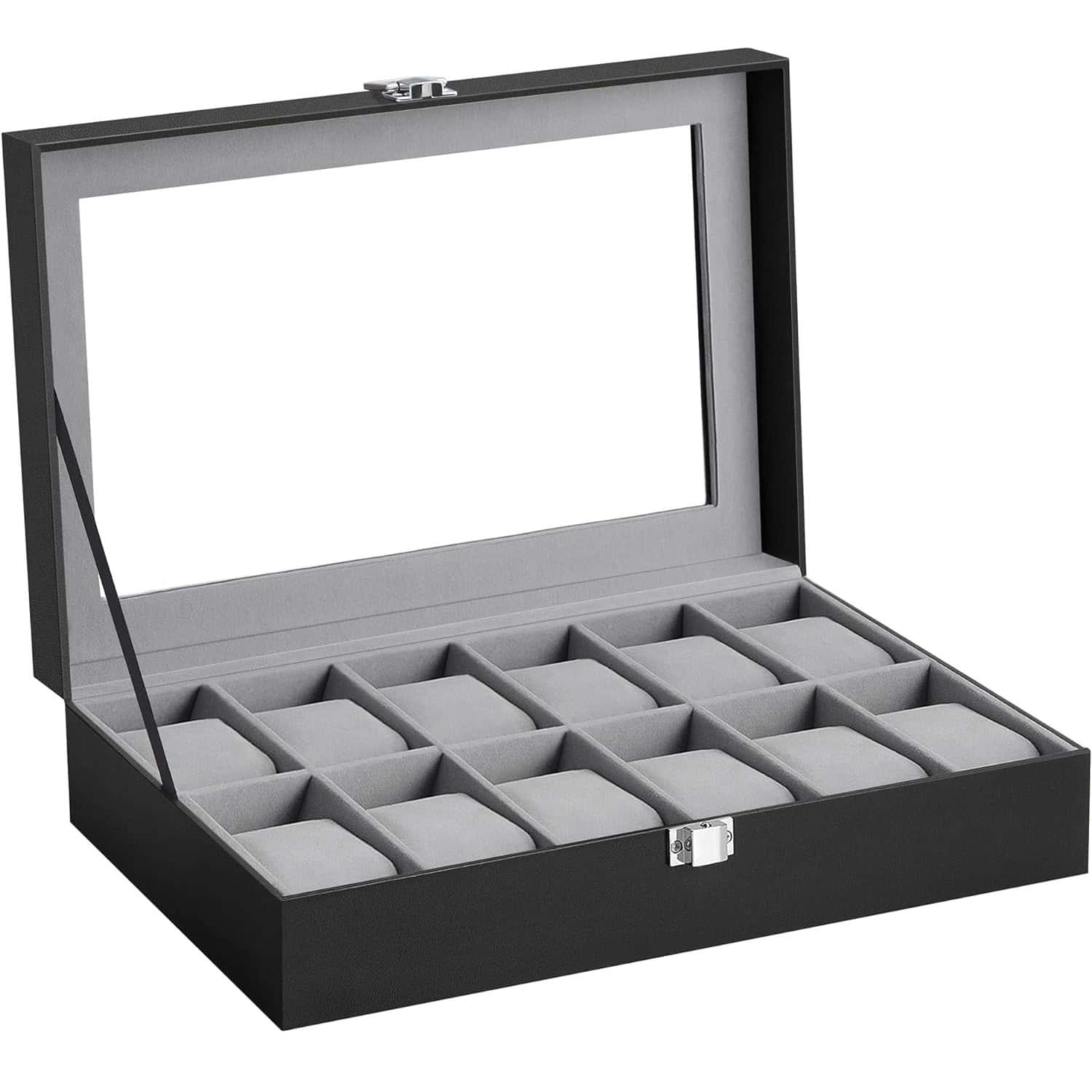 Cutie depozitare si organizare ceasuri, cu 12 locuri, piele sintetica, cu capac de sticla, 20x30x8cm, negru Mob360