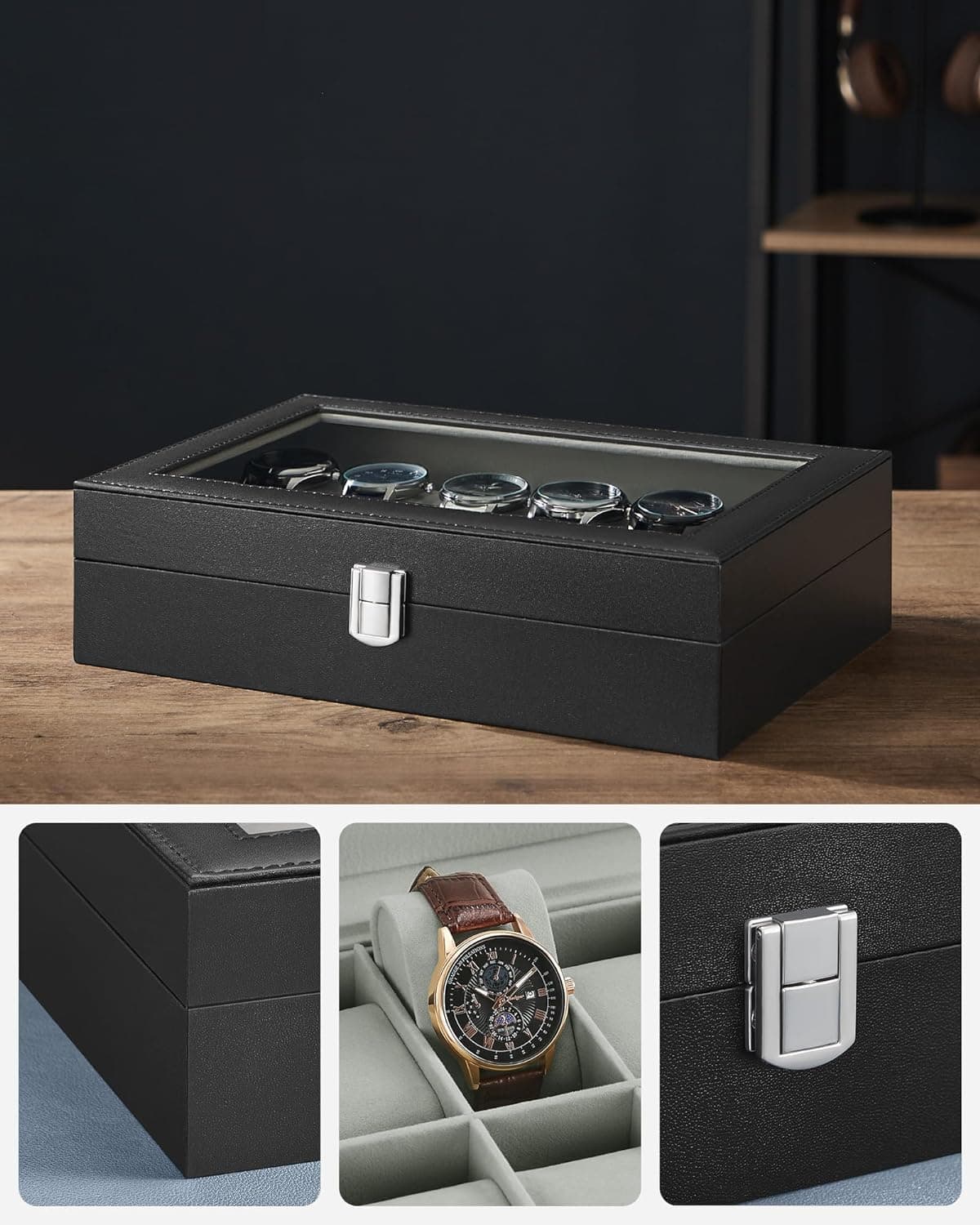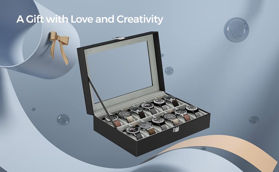 Cutie depozitare si organizare ceasuri, cu 12 locuri, piele sintetica, cu capac de sticla, 20x30x8cm, negru Mob360 – produs disponibil în magazinul Mob360.