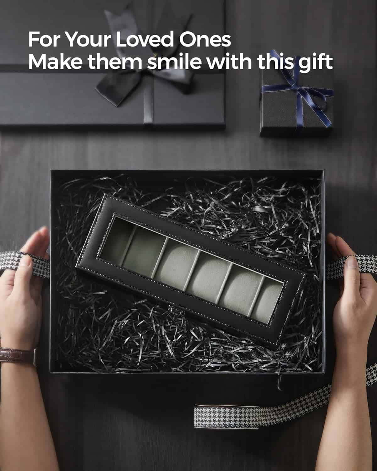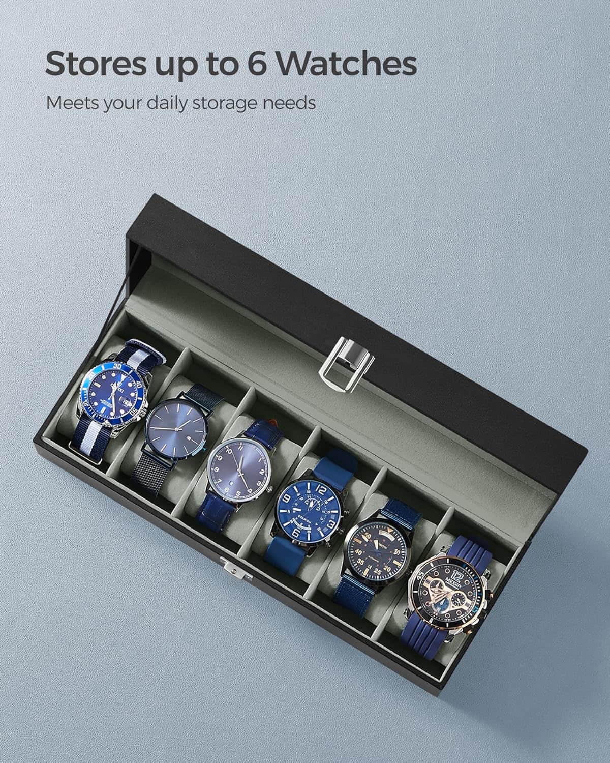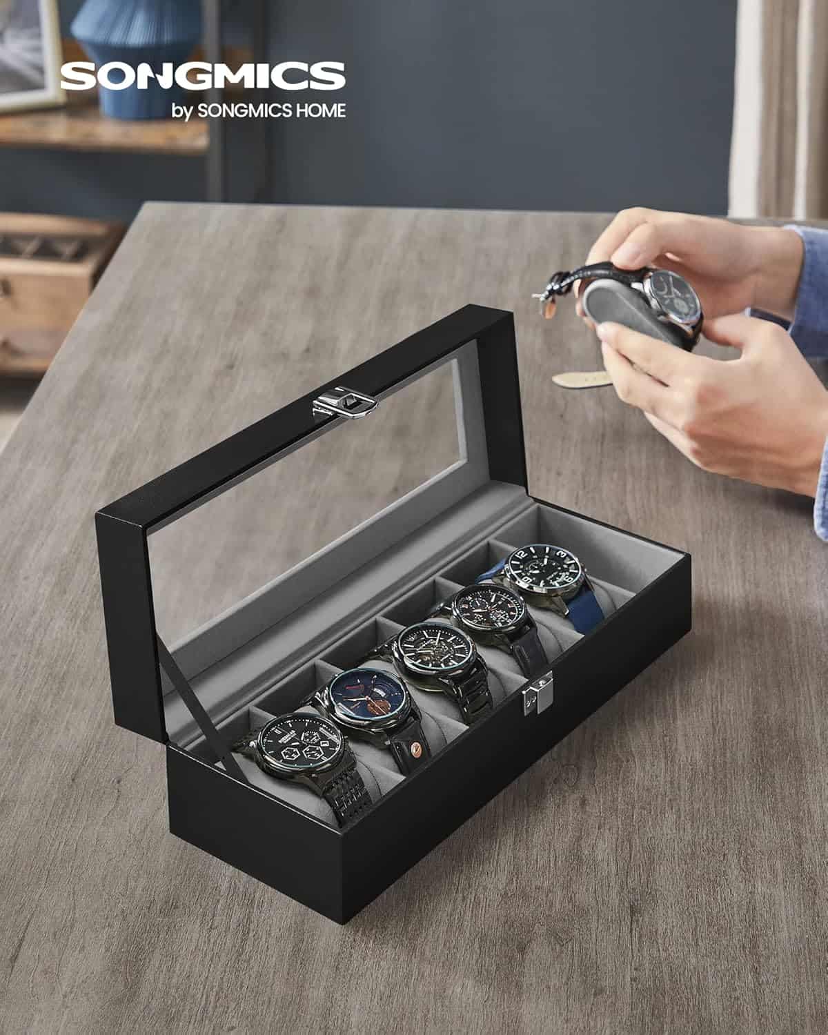 Cutie depozitare si organizare ceasuri, cu 6 locuri, MDF si PU, 11x30x8cm, negru Mob360