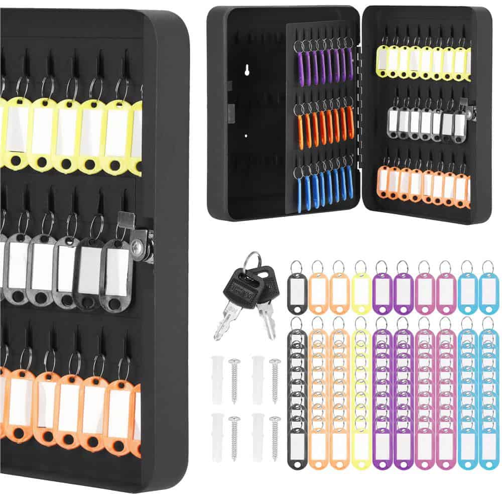 PARAMETRI: Culoarea carcasei: negru Culoare breloc: multicolor (mix) Material: otel Finisaj: mat Blocare prin inel de chei: da Numarul de carlige pentru chei: 100 Numar de brelocuri: 100 Numarul de chei pentru carcasa: 2 Dimensiuni: Latime: 24 cm Adancime: 7 cm Inaltime: 30 cmSeparator metalic in interior: 26 x 22 cm Peretii grosi ai casetei asigura o buna protectie a cheilor din interior. Cu produsul nostru, puteti fi siguri ca nu veti pierde niciodata niciuna dintre cheile dumneavoastra. Constructia solida a casetei garanteaza siguranta si discretie. Daca profitati de oferta noastra, nu veti primi doar o carcasa rezistenta si durabila, ci si un set de etichete pentru chei. Cu ajutorul acestora, veti mentine ordinea si organizarea. Pentru a evita ca dulapul sa se piarda sau sa fie furat din greseala, montati-l pe perete! Dulapul are gauri pre-gaurite si veti primi in plus dibluri cu suruburi de la noi in kit. Produsul are culori discrete si universale, chiar si plasat pe perete nu va fi vizibil. Cutia de chei este un instrument extrem de util in multe medii. Suporturile pentru chei incluse faciliteaza pastrarea in ordine a cheilor depozitate. Incuietoarea cu cheie protejeaza continutul Fabricat din materiale durabile si puternice Inclus: elemente de montare / brelocuri de chei Echipat cu 100 de carlige pentru chei Incuiat cu cheie de blocare Culori discrete Poate fi combinat cu alte accesorii Poate fi montat pe perete Interiorul are un separator mobil cu carlige pentru o capacitate de depozitare mai mare