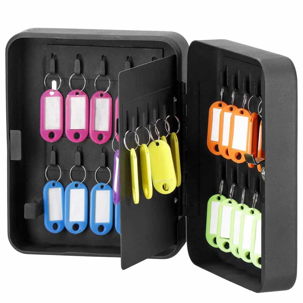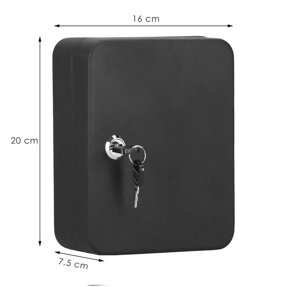 Culoarea carcasei: negru Culoare breloc: multicolor (mix) Material: otel Finisaj: mat Inchidere cu cheie: da Numarul de carlige pentru chei: 30 Numar de brelocuri: 30 Numarul de chei pentru carcasa: 2 Separator mobil cu carlige in interior Dimensiuni: Latime: 20 cm Adancime: 16 cm Inaltime: 7,5 cm Separator interior: 17 x 13 cm Peretii grosi ai casetei asigura o buna protectie a cheilor din interior. Cu produsul nostru, puteti fi siguri ca nu veti pierde niciodata niciuna dintre cheile dumneavoastra. Constructia solida a casetei garanteaza siguranta si discretie. Daca profitati de oferta noastra, nu veti primi doar o carcasa rezistenta si durabila, ci si un set de etichete pentru chei. Cu ajutorul acestora, veti mentine ordinea si organizarea. Pentru a evita ca dulapul sa se piarda sau sa fie furat din greseala, montati-l pe perete! Dulapul are gauri pre-gaurite si veti primi in plus dibluri cu suruburi de la noi in kit. Produsul are culori discrete si universale, chiar si plasat pe perete nu va fi vizibil. Cutia de chei este un instrument extrem de util in multe medii. Suporturile pentru chei incluse faciliteaza pastrarea in ordine a cheilor depozitate. Incuietoarea cu cheie protejeaza continutul Fabricat din materiale durabile si puternice Inclus: elemente de montare / brelocuri de chei Echipat cu 30 de carlige pentru chei Incuiat cu cheie de blocare Culori discrete Poate fi combinat cu alte accesorii Poate fi montat pe perete Interiorul are un separator mobil cu carlige pentru o capacitate de depozitare mai mare