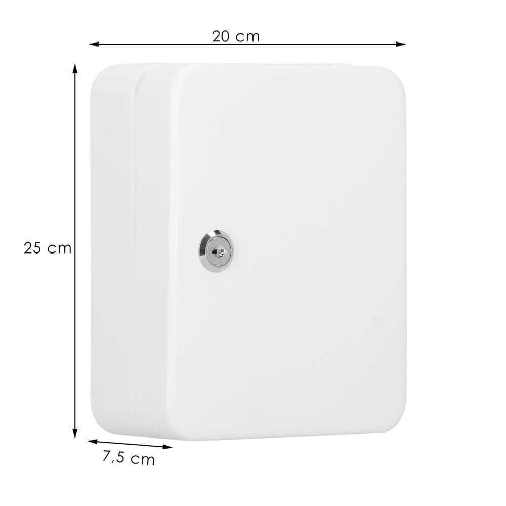 Culoarea carcasei: alb Culoare breloc: multicolor (mix) Material: otel Finisaj: mat Inchidere cu cheie: da Numarul de carlige pentru chei: 48 Numar de brelocuri: 48 Numarul de chei pentru carcasa: 2 Dimensiuni: Latime: 25 cm Adancime: 20 cm Inaltime: 7,5 cm Separator metalic in interior: 21 x 17 cm Peretii grosi ai casetei asigura o buna protectie a cheilor din interior. Cu produsul nostru, puteti fi siguri ca nu veti pierde niciodata niciuna dintre cheile dumneavoastra. Constructia solida a casetei garanteaza siguranta si discretie. Daca profitati de oferta noastra, nu veti primi doar o carcasa rezistenta si durabila, ci si un set de etichete pentru chei. Cu ajutorul acestora, veti mentine ordinea si organizarea. Pentru a evita ca dulapul sa se piarda sau sa fie furat din greseala, montati-l pe perete! Dulapul are gauri pre-gaurite si veti primi in plus dibluri cu suruburi de la noi in kit. Produsul are culori discrete si universale, chiar si plasat pe perete nu va fi vizibil. Cutia de chei este un instrument extrem de util in multe medii. Suporturile pentru chei incluse faciliteaza pastrarea in ordine a cheilor depozitate. Incuietoarea cu cheie protejeaza continutul Fabricat din materiale durabile si puternice Inclus: elemente de montare / brelocuri de chei Echipat cu 48 de carlige pentru chei Incuiat cu cheie de blocare Culori discrete Poate fi combinat cu alte accesorii Poate fi montat pe perete Interiorul are un separator mobil cu carlige pentru o capacitate de depozitare mai mare