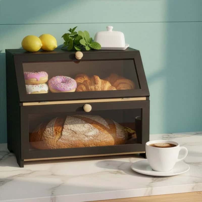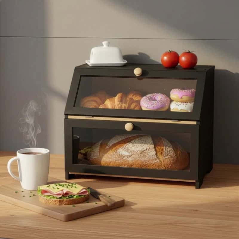 Cutie pentru paine cu 2 niveluri din bambus, cu ferestre transparente si inchidere magnetica, 39x25x32 cm, negru Mob360 – produs disponibil în magazinul Mob360.