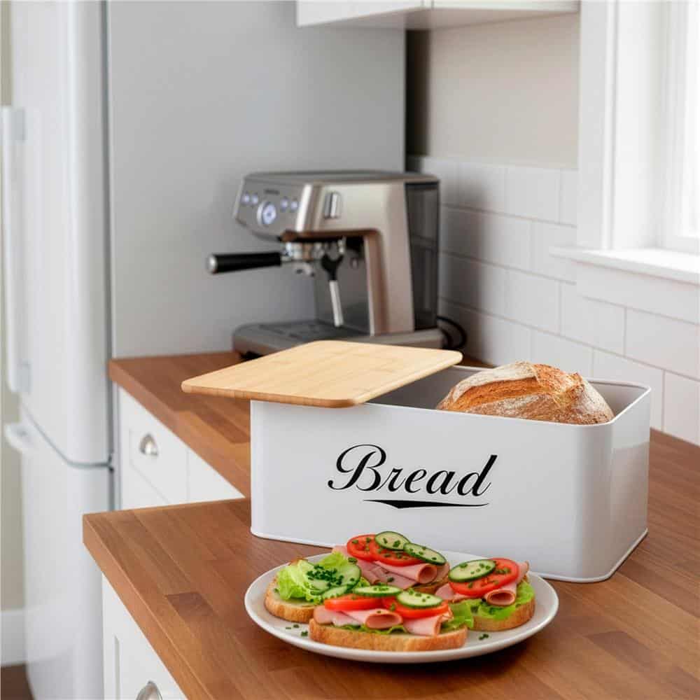 Cutie pentru paine din metal cu capac din bambus, finisaj lucios, 33x18x14 cm, alb Mob360 – produs disponibil în magazinul Mob360.