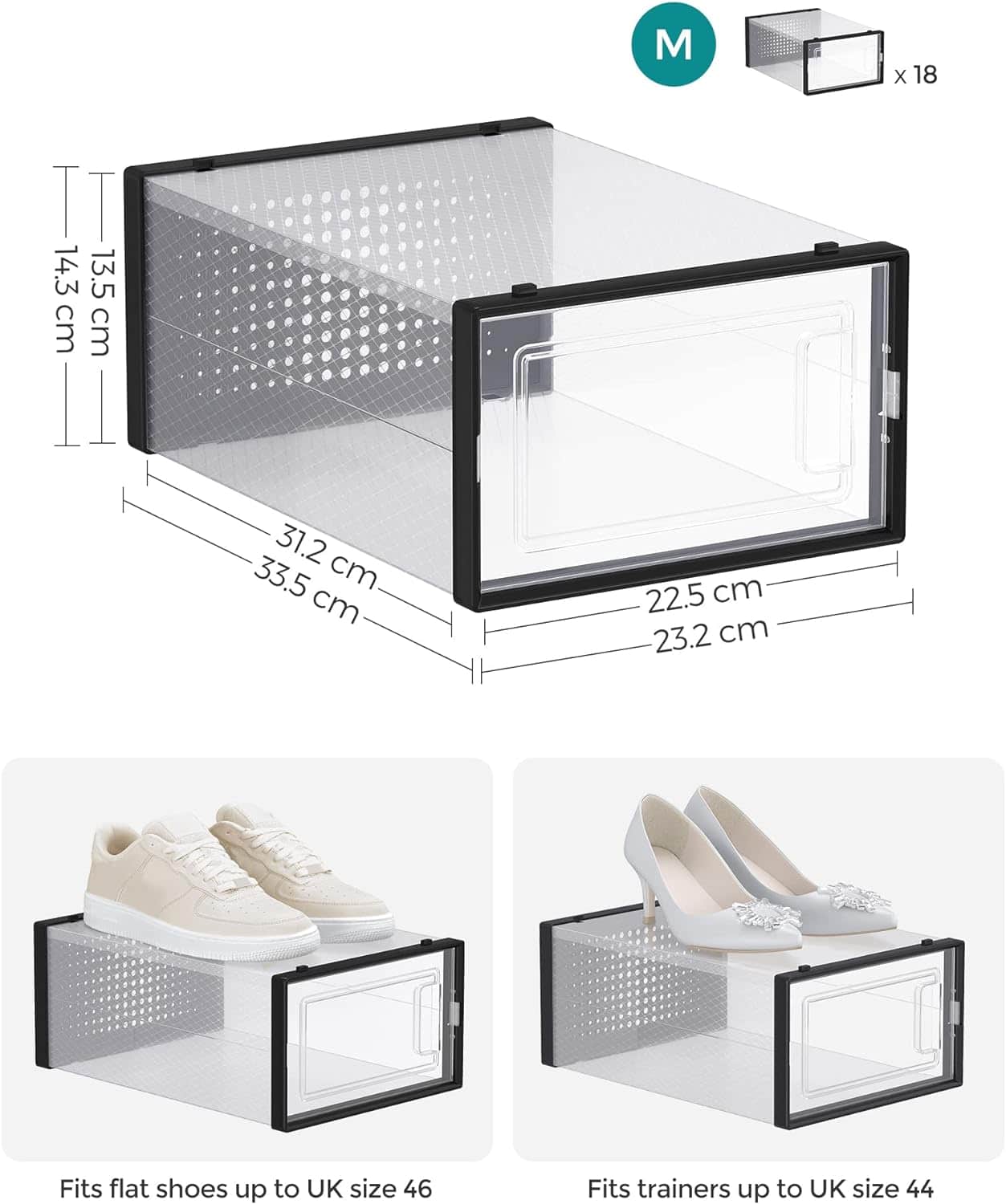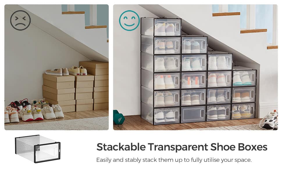 Cutii de pantofi, set de 18 organizatoare stivuibile, structura rezistenta ABS, 34x23x14cm, transparent si negru Mob360 – produs disponibil în magazinul Mob360.