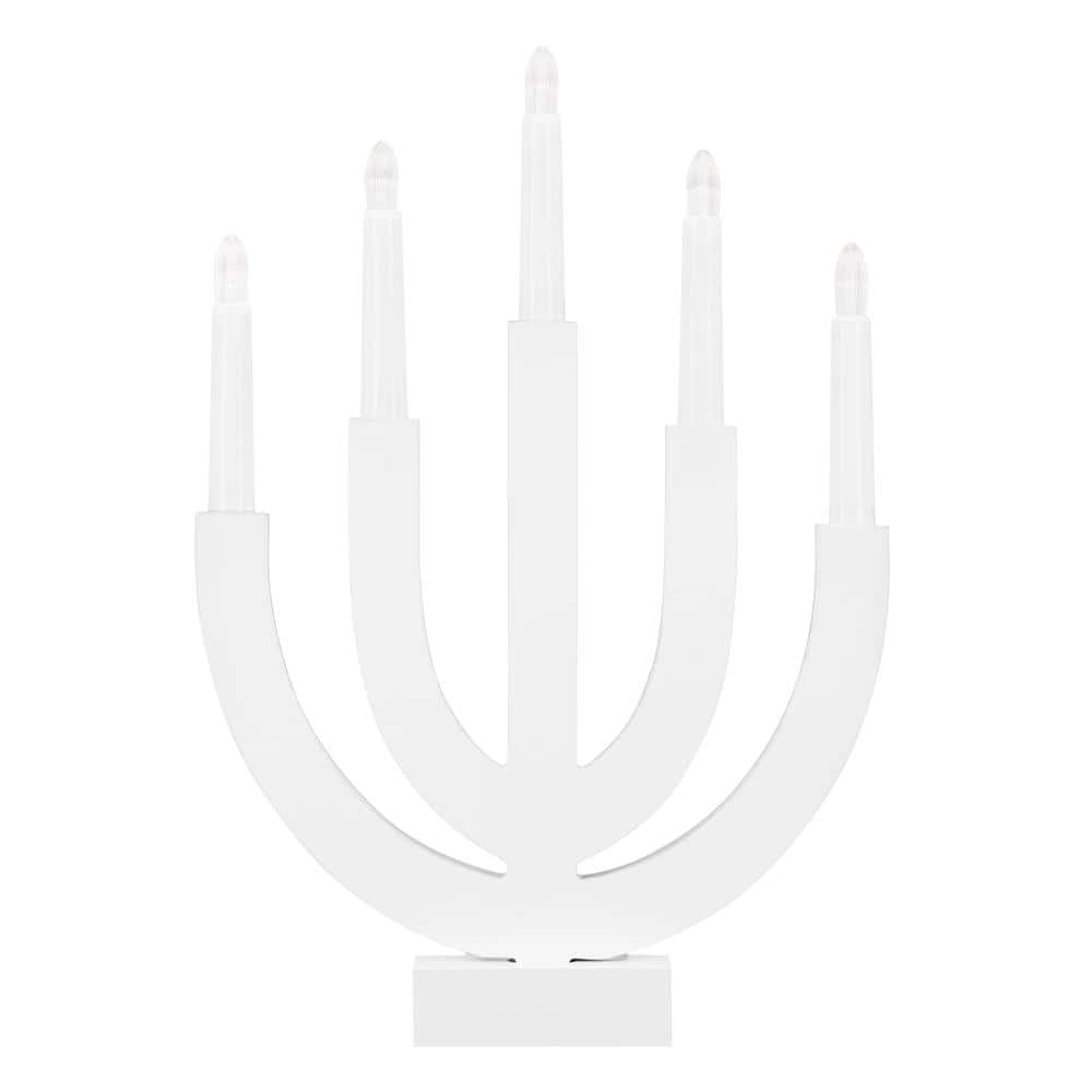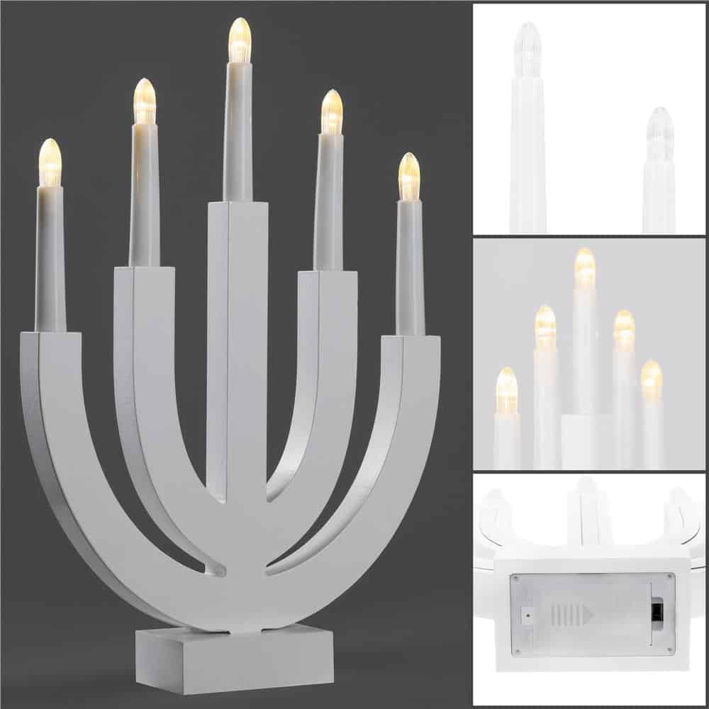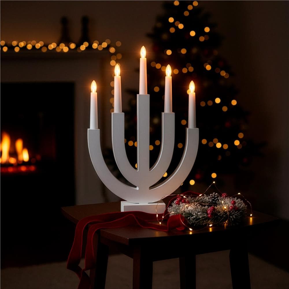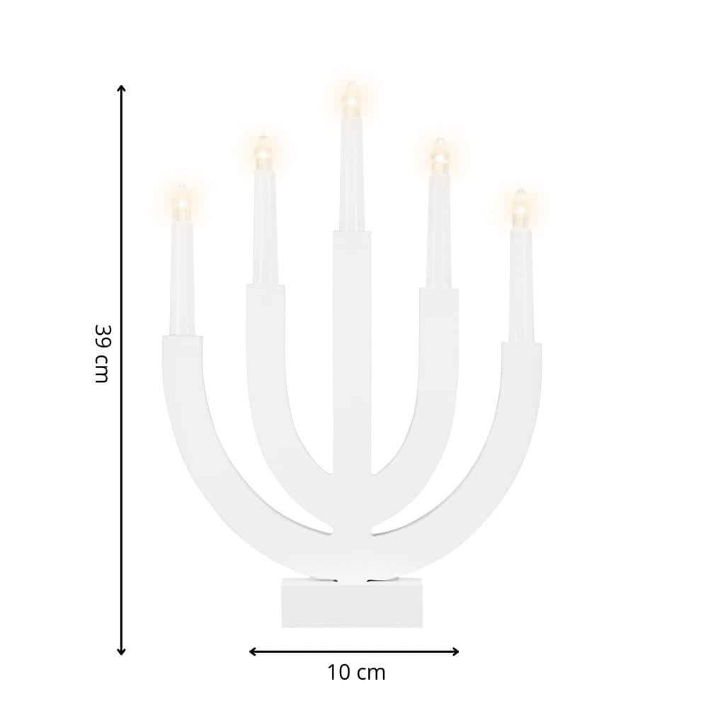 Specificatii tehnice Material: lemn, plastic Culoare: alb Culoare lumina: alb cald Certificare: CE Clasa protectie: IP20 Alimentare: 2 x AA Intrerupator: ON/OFF Numar LED: 5 Inaltime maxima: 39 cm Inaltime brate: 31.5 / 35 / 39 cm Latime maxima: 27 cm Dimensiuni brate: 3 x 3 cm Dimensiuni baza: 10 x 6 x 3 cm Utilizare: interior Scurta descriere Decoratiune luminoasa eleganta realizata din lemn si plastic, ideala pentru a adauga o nota calda si placuta oricarui spatiu interior. Functioneaza pe baterii, este usor de pozitionat si ofera o lumina ambientala blanda datorita celor 5 LED-uri cu lumina calda. Caracteristici principale Lumina calda pentru atmosfera placuta Constructie din lemn si plastic Functionare pe baterii pentru mobilitate Comutator ON/OFF integrat Potrivita pentru decor interior Design minimalist si modern