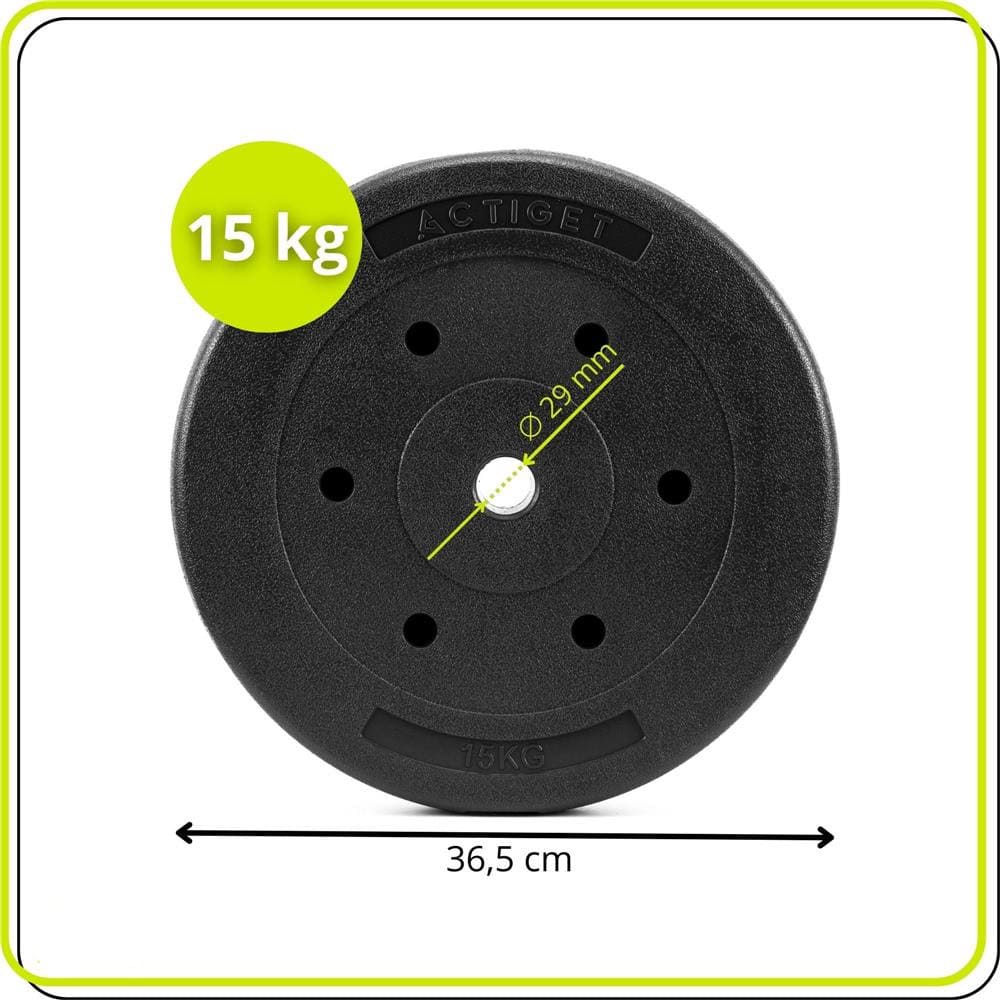 Specificatii tehnice: Material: exterior PP, umplutura bitumica Culoare: negru Greutate: 15 kg Diametru total: 36,5 cm Grosime: 6 cm Diametru interior: 29 mm Scurta descriere: Discul de 15 kg este potrivit pentru antrenamente de forta acasa sau la sala. Exteriorul din PP protejeaza suprafetele si reduce zgomotul in timpul utilizarii. Umplutura bitumica ofera echilibru si stabilitate. Compatibil cu bare cu diametru de 29 mm, ideal pentru exercitii precum genuflexiuni, impins sau indreptari. Caracteristici principale: Greutate 15 kg pentru antrenamente de forta Exterior din PP pentru protectie si durabilitate Umplutura bitumica pentru stabilitate Compatibil cu bare de 29 mm Usor de manevrat si montat Intretinere simpla cu laveta umeda