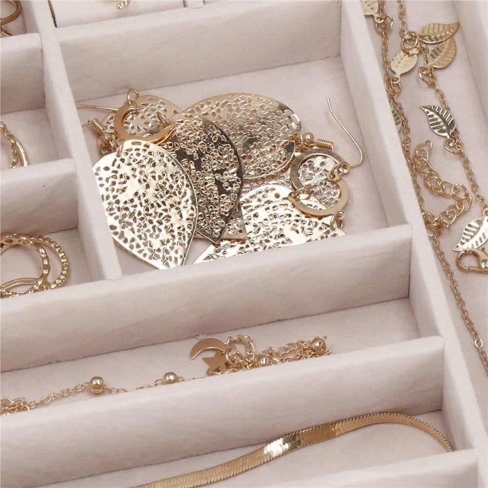 CUTIE DE BIJUTERII Material: piele ecologica + piele de caprioara + mdf Culoare: burgundy + ornament decorativ Culoare interioara: roz deschis Dimensiunea cutiei inchise: 26 x 26 x 8,5 cm Latimea trunchiului: 26 cm Inaltime: 8,5 cm Adancime; 26 cm Inchidere: dublu clic pe cheie Fiecare femeie iubeste bijuteriile. Le poate purta in fiecare zi, la petreceri, la ocazii speciale in doi. Dar unde sa le pastram, astfel incat sa nu se piarda sau sa se incurce? O cutie de bijuterii este o idee grozava pentru depozitarea accesoriilor valoroase! Cu ajutorul ei, totul va fi intotdeauna la locul lui .Cutia de bijuterii va va permite sa va organizati corespunzator locul pentru accesoriile de styling. Isi va gasi locul intr-un dulap, pe o masuta de toaleta sau pe o comoda. Avand toate bijuteriile preferate intr-un singur loc, puteti uita de cautarea unui alt cercel care s-a pierdut pe undeva sau sa desfaci colierul. Atunci cand plecati intr-o calatorie lunga, merita sa va echipati cu un organizator de bijuterii, astfel incat sa nu se piarda nimic atunci cand despachetati. Datorita dimensiunii sale compacte, se va potrivi cu usurinta in bagajul dumneavoastra. Lanturile vor inceta sa se mai incurce! Compartimente spatioase pentru a va organiza accesoriile Dimensionat pentru calatorie O oglinda care poate fi indispensabila Materialul interior este sigur pentru accesoriile de bijuterii Capac stabil in pozitie deschisa Inchiderea cu cheie permite depozitarea in siguranta a bijuteriilor Design elegant Cadoul perfect pentru o prietena, mama sau iubita. INTERIORUL CUTIEI: 12x compartimente mici: 3 x 3 cm 3x compartimente: 17,5 x 2,5 cm 2x compartimente: 23,5 x 2,5 cm 1x compartiment: 6,5 x 6,5 cm 2 x compartiment pentru inele: 6,5 x 3,5 cm oglinda: 11 x 8 cm 4x carlige pentru pandantive 1x buzunar din material textil: 25 x 9,5 cm Nivelul 2: 9x compartimente: 8,5 x 8,5 cm