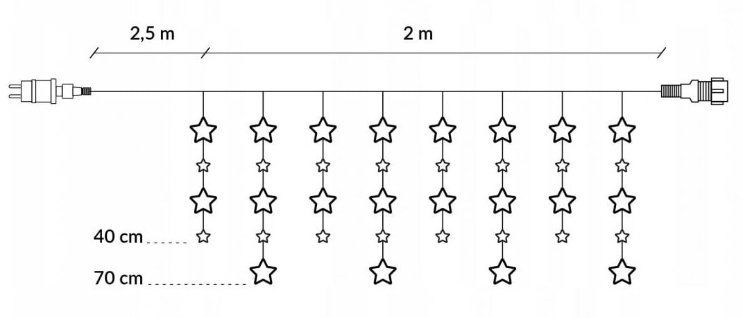 Culoare: alb caldProgramator cu 8 functiiLungimea piesei iluminante: aproximativ 2 mLungimea cablului: aproximativ 2.5 mAsezarea turturilor la fiecare 18 cmLungimea ghetului: 40cm / 70cmLatimea stelelor: 18,5 cmDimensiunea lunilor stea: 8×10 cmLampi de gheata 92 LED-uriAlimentare 220-240vLED-uri cu economie de energieAlimentat electricArderea unei diode nu opreste setul!Diodele impermeabile – pot fi scufundate in apa – fara alimentareLampi pe fire de cupru durabile cu diametrul de 1,3 mm, rezistente la rupereCE, certificat RoHSClasa de etanseitate IP44Utilizare externa si interna Perdeaua de lumina are un program de iluminare cu 8 functii: combinatie, val, secventa, slo-glo, intermitent, schimbare lenta a culorii, intermitent, lumina constanta