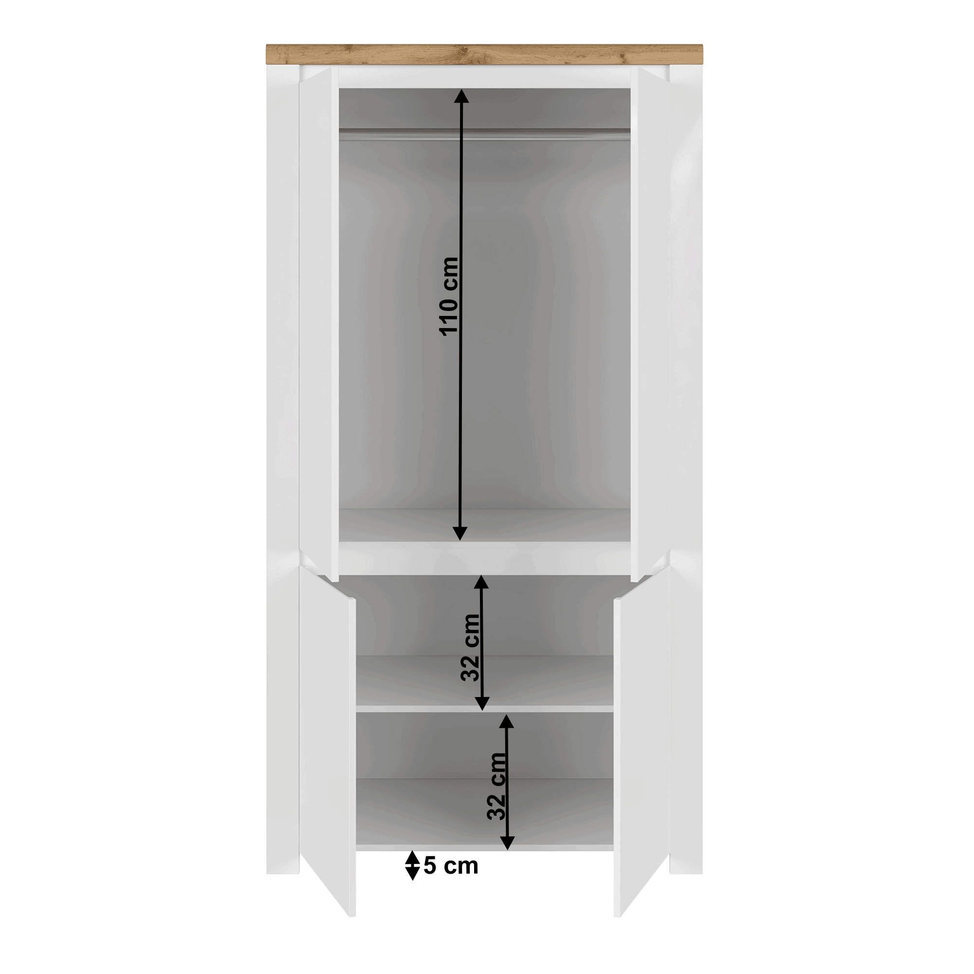 Material: DTD laminat/ canturi ABS/ MDF Culoare: alb foarte lucios/ stejar wotan Dimensiuni (LxAxÎ): 106x56x202 cm Grosimea materialului: 1,6 până la 2,2 cm Înălţimea spaţiului inferior de la podea: 5 cm 4 uşi 3 rafturi, 1 tijă de agăţat Există rafturi în dulapuri Înălţimea raftului superior: 110 cm Înălţime rafturi inferioare: 32 cm O mulţime de spaţiu de depozitare Deschidere/închidere cu o decupare Fără mânere Uşă din MDF Livrat dezasamblat
