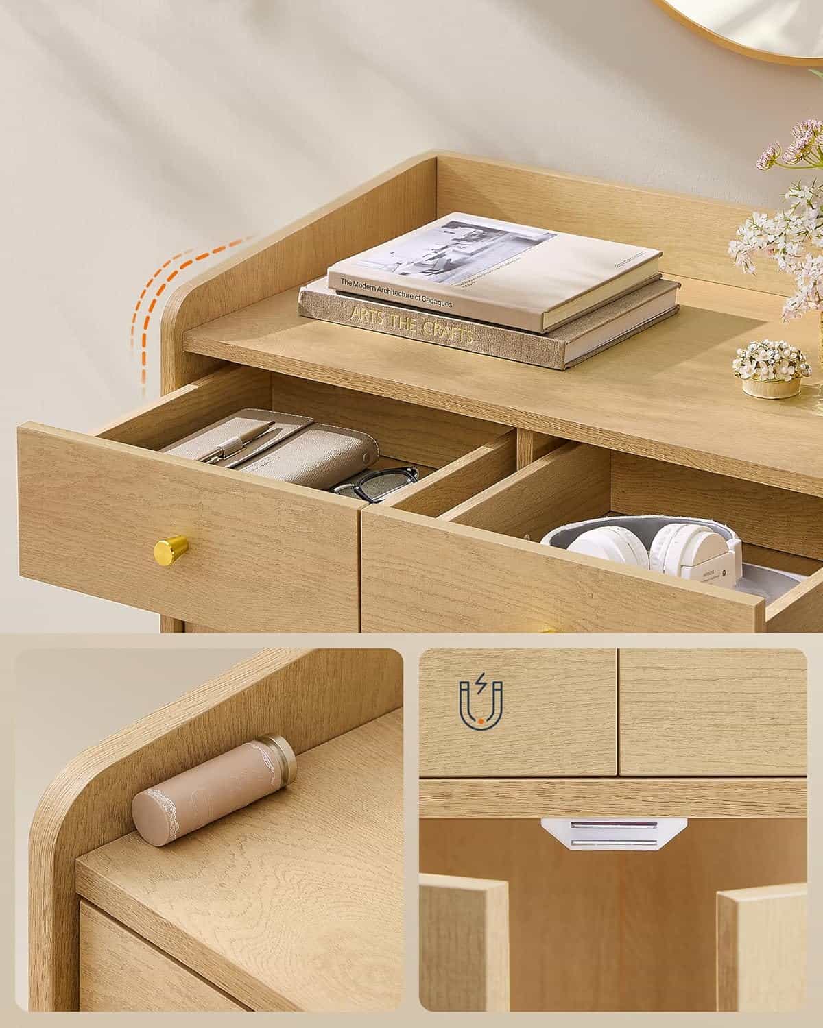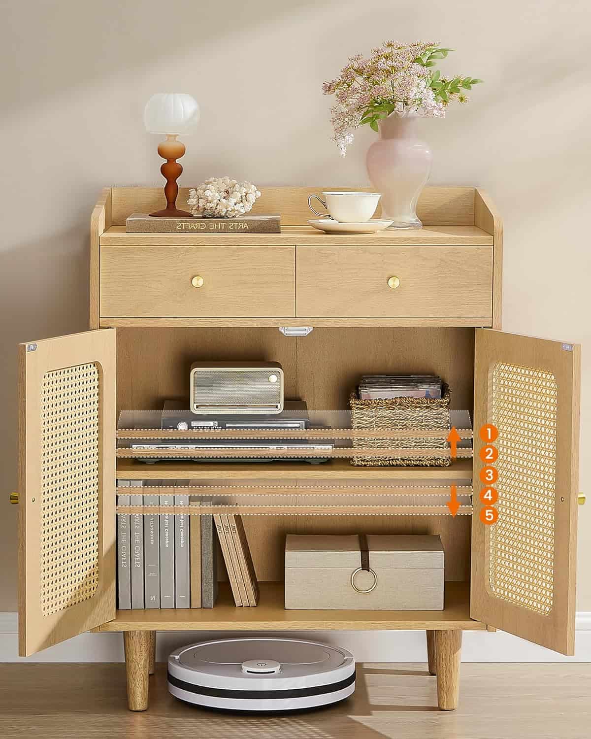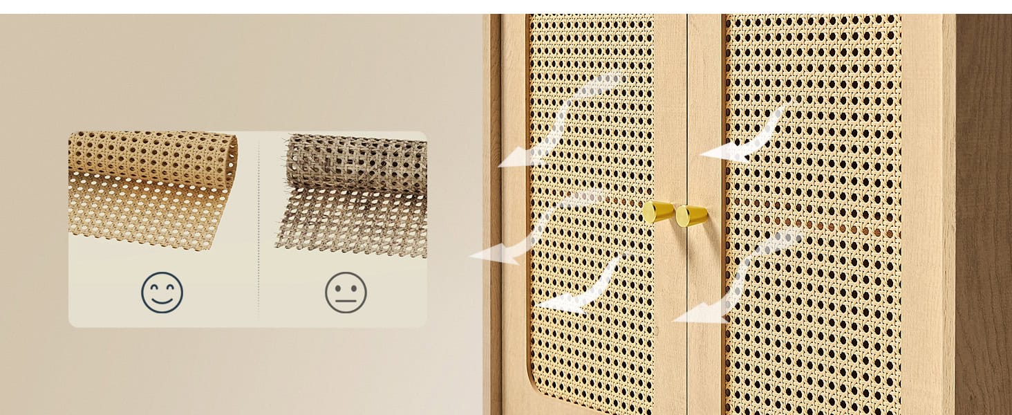 - Din motive de siguranta, dulapul trebuie fixat de perete folosind dispozitivul anti-inclinare inclus. Va rugam sa nu depasiti sarcina maxima a bufetului. Acest dulap provine din colectia SONGMICS. Culoare naturala, picioare din lemn masiv, rachita – va ajuta sa va creati oaza de calm si sa va relaxati mintea si corpul. Multiplu spatiu de depozitare: