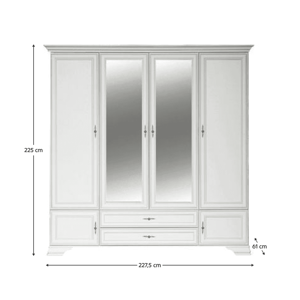Material: DTD laminat Culoare: alb alpin Dimensiuni (lxAxh): 227,5x61x225 cm Grosime material: 1,6 cm Cu oglindă şase uşi Pe picioare Înălţimea picioarelor: 8 cm Mânere metalice Culoarea mânerelor: argint antic Spaţiu de depozitare 2 sertare Portanţă sertar: 3 kg Bară de umeraşe Cu zonă cu poliţe Portanţă poliţă: 4 kg Vă recomandăm să ataşaţi mobilierul de perete Se livrează dezasamblat