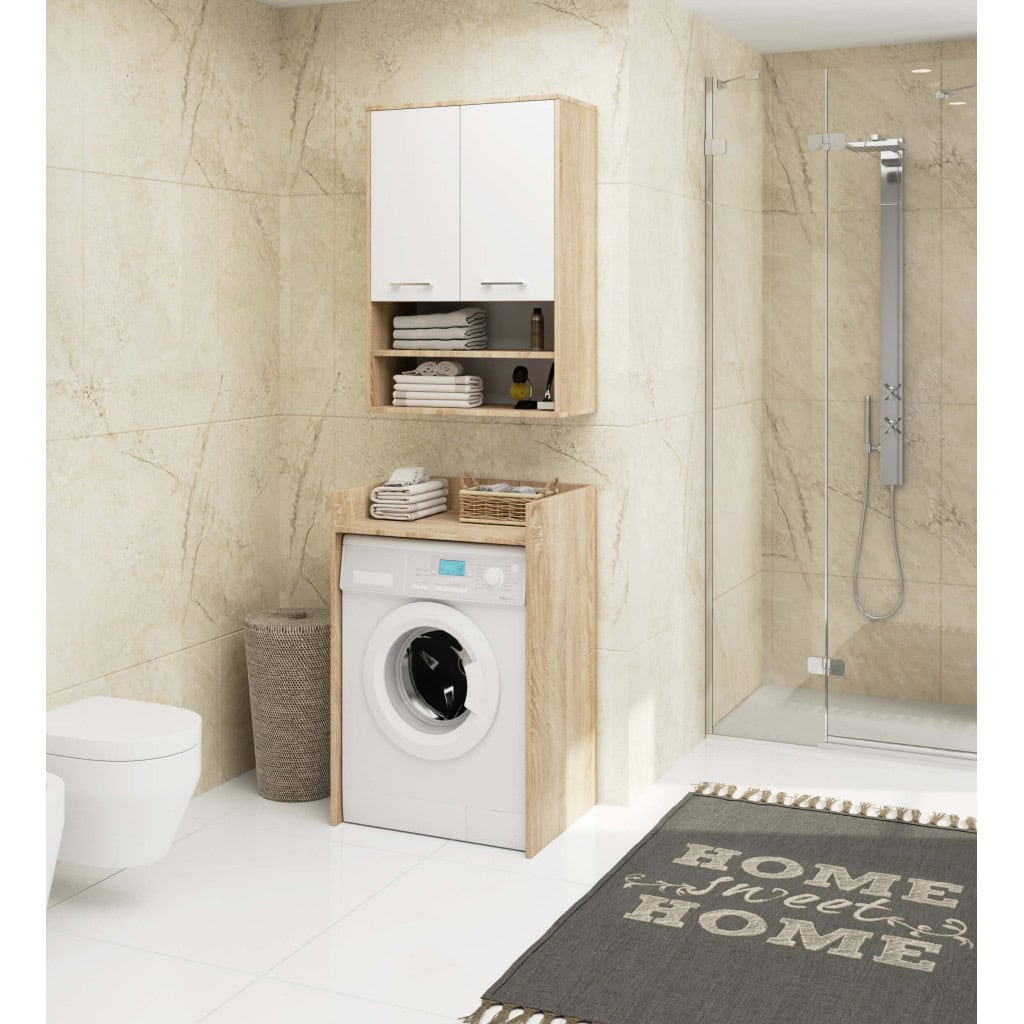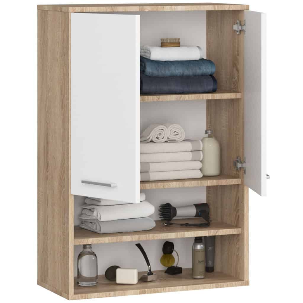Dulap baie suspendat, cu 2 usi si 2 rafturi deschise, PAL 16 mm, 64x30x94 cm, stejar sonoma si alb Mob360