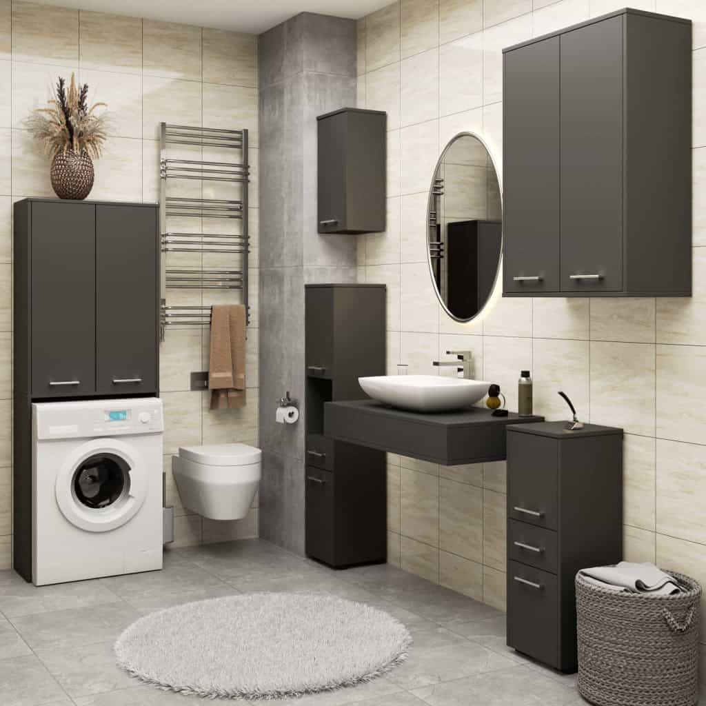 Dulap baie suspendat, cu 2 usi si 4 rafturi interioare, PAL 16 mm, 64x30x94 cm, gri grafit Mob360 – produs disponibil în magazinul Mob360.