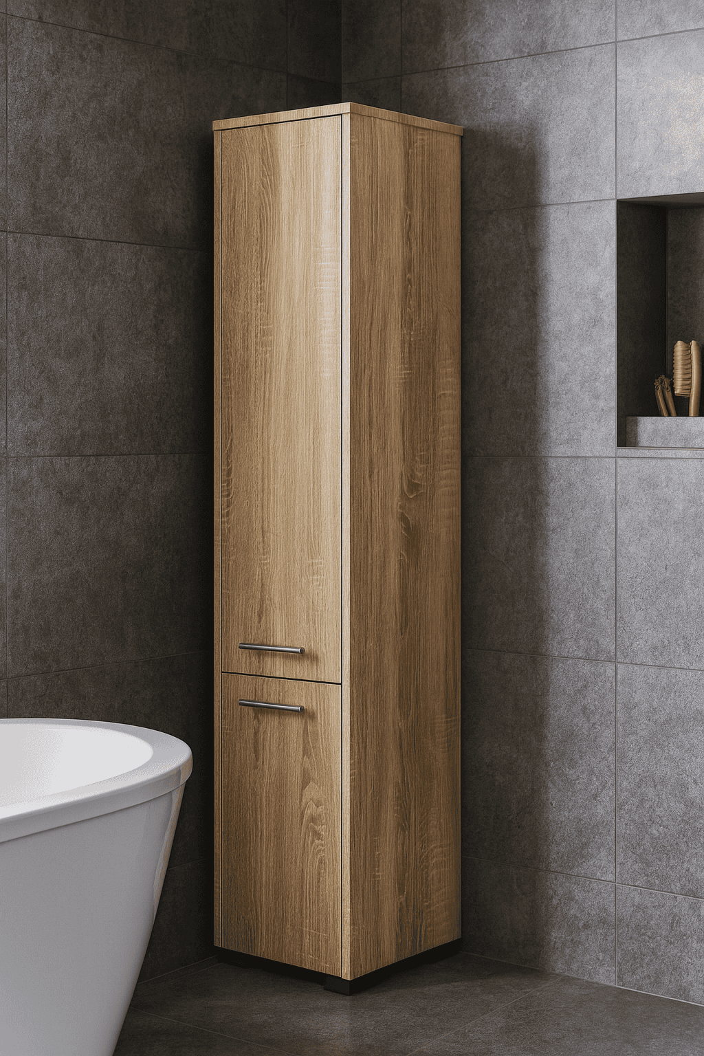 Specificatii tehnice Model: FIN Material: PAL laminat Kronospan Finisaj: Mat Culoare: Stejar sonoma Latime: 30 cm Adancime: 30 cm Inaltime: 140 cm Numar usi: 2 Tip usi: Usi pline, cu deschidere clasica Numar rafturi: 5 Grosime placa: 16 mm Margine: ABS Functii suplimentare: Posibilitate de montaj suspendat sau asezare pe podea Manere: Argintii, ergonomice Scurta descriere Dulapul de baie FIN este o solutie practica si eleganta pentru organizarea eficienta a spatiului. Finisajul in stejar sonoma ofera un aspect natural si luminos, potrivit atat bailor clasice, cat si celor moderne. Cele doua usi ascund cinci rafturi incapatoare, perfecte pentru depozitarea prosoapelor, produselor cosmetice si articolelor de curatenie. Caracteristici principale Constructie din PAL laminat rezistent la zgarieturi si umezeala Design modern in finisaj stejar sonoma mat Doua usi cu manere argintii ergonomice Cinci rafturi interne pentru depozitare organizata Margini protejate cu ABS pentru durabilitate crescuta Posibilitate de montaj suspendat sau asezare pe podea Ideal pentru bai de orice dimensiune Montaj simplu, cu instructiuni incluse