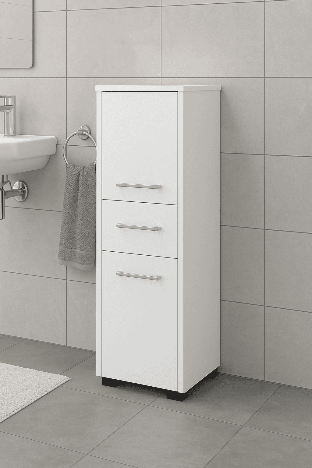 Dulap baie tip coloana cu 2 usi si sertar, PAL laminat, 30x30x85 cm, alb mat Mob360 – produs disponibil în magazinul Mob360.