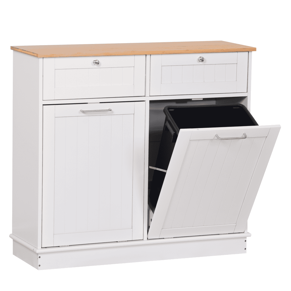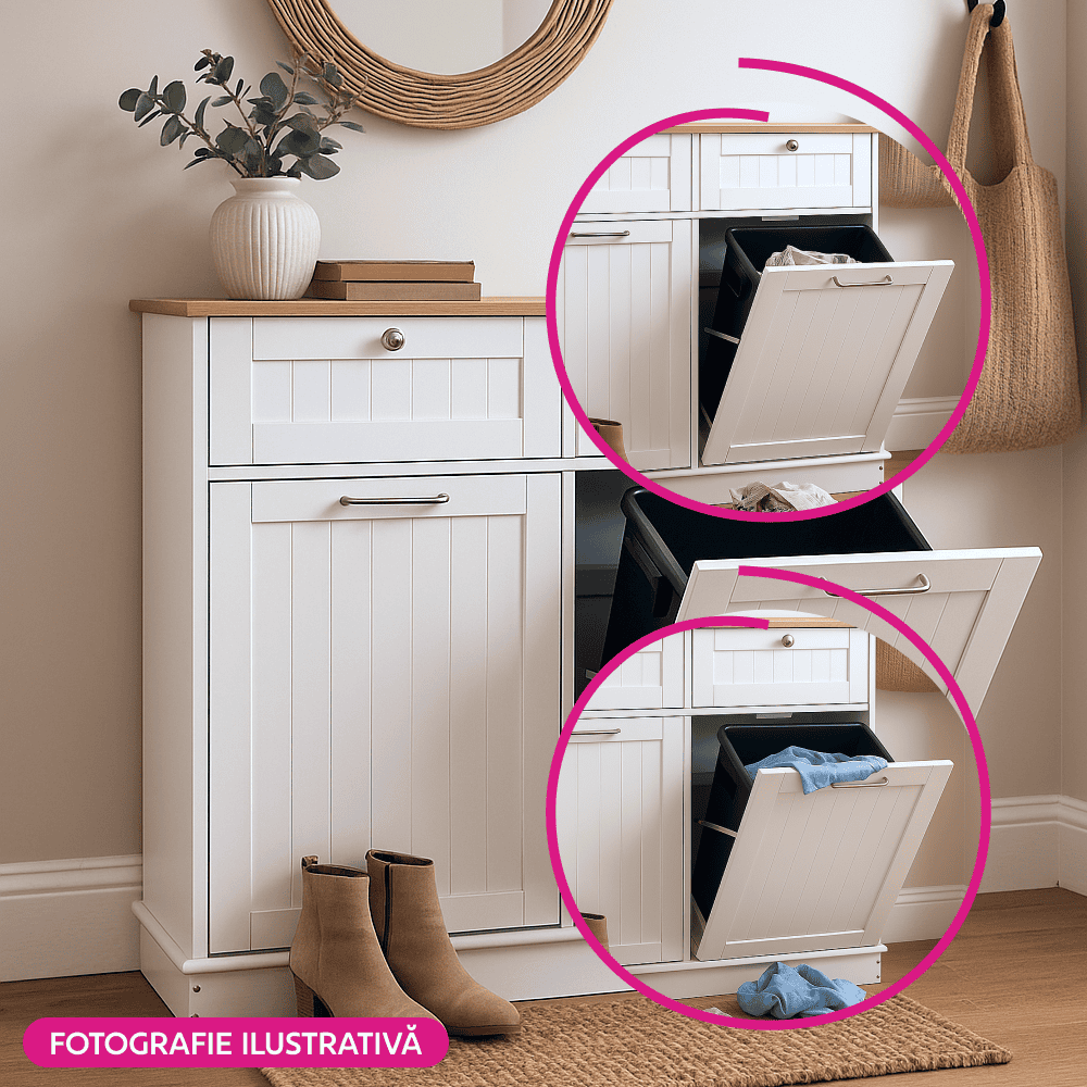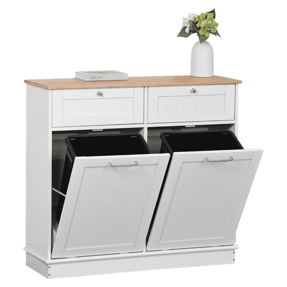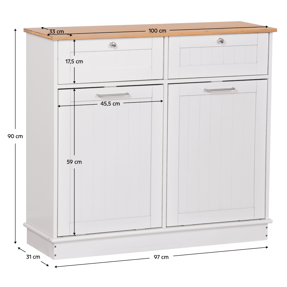 Material: MDF înfoliat/bambus lăcuit Culoare: alb/bambus natural Dimensiuni (lxAxh): 100x33x90 cm 2 Sertare Dimensiuni interioare ale sertarului (lxAxh): 43×26,8×15 cm Uşă cu deschidere batantă Se livrează cu 2 coşuri de gunoi Volum coş: 40 l Portanţă coş: 50 kg Mânere argintii Material mâner: oţel inoxidabil Ideal pentru bucătărie, baie sau ca spaţiu de depozitare pentru animale de companie Multifuncţional Livrat dezasamblat