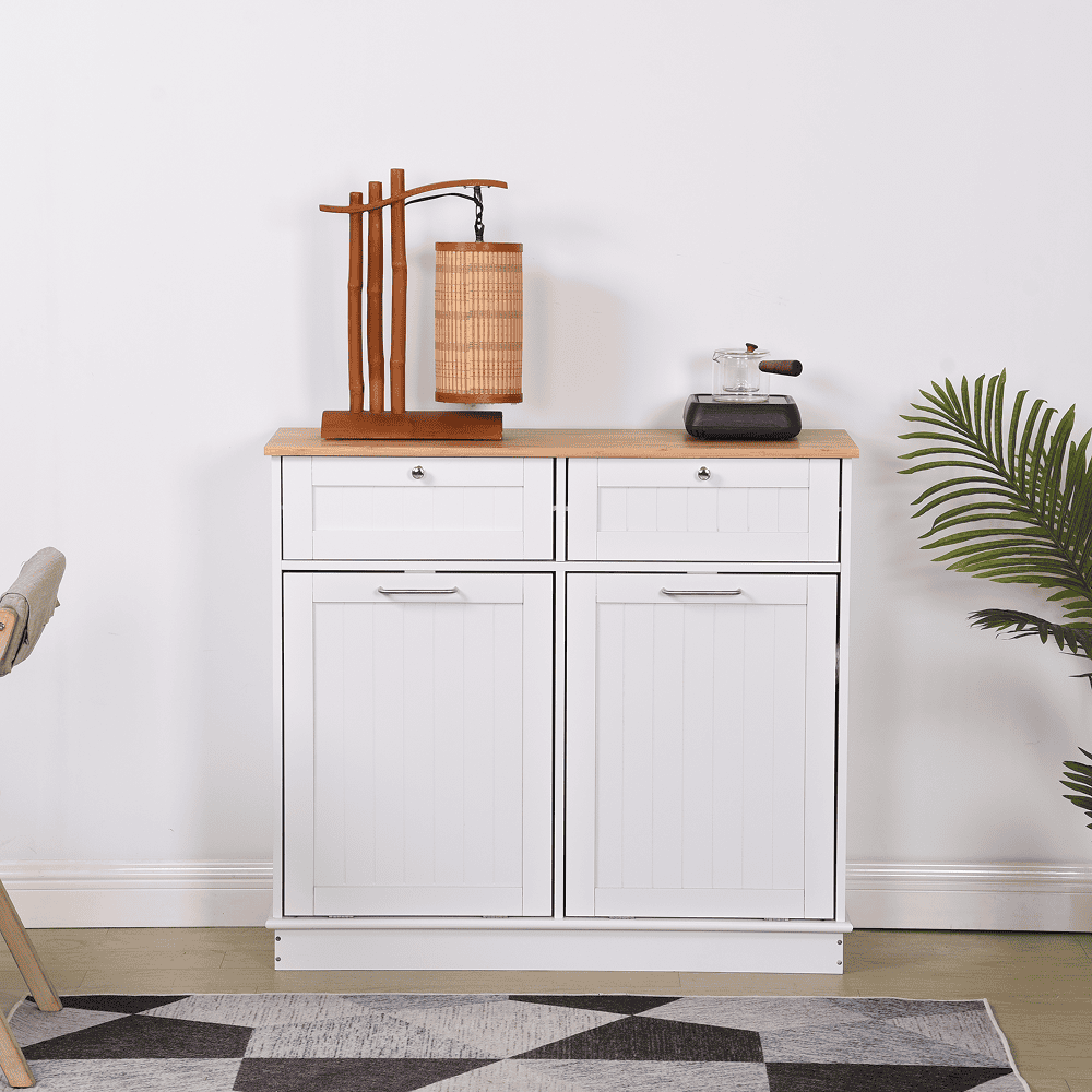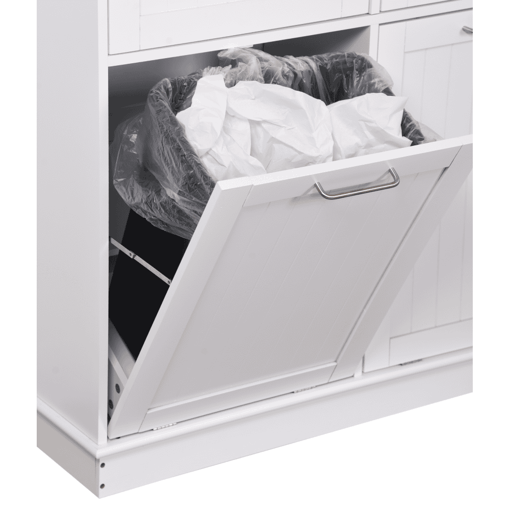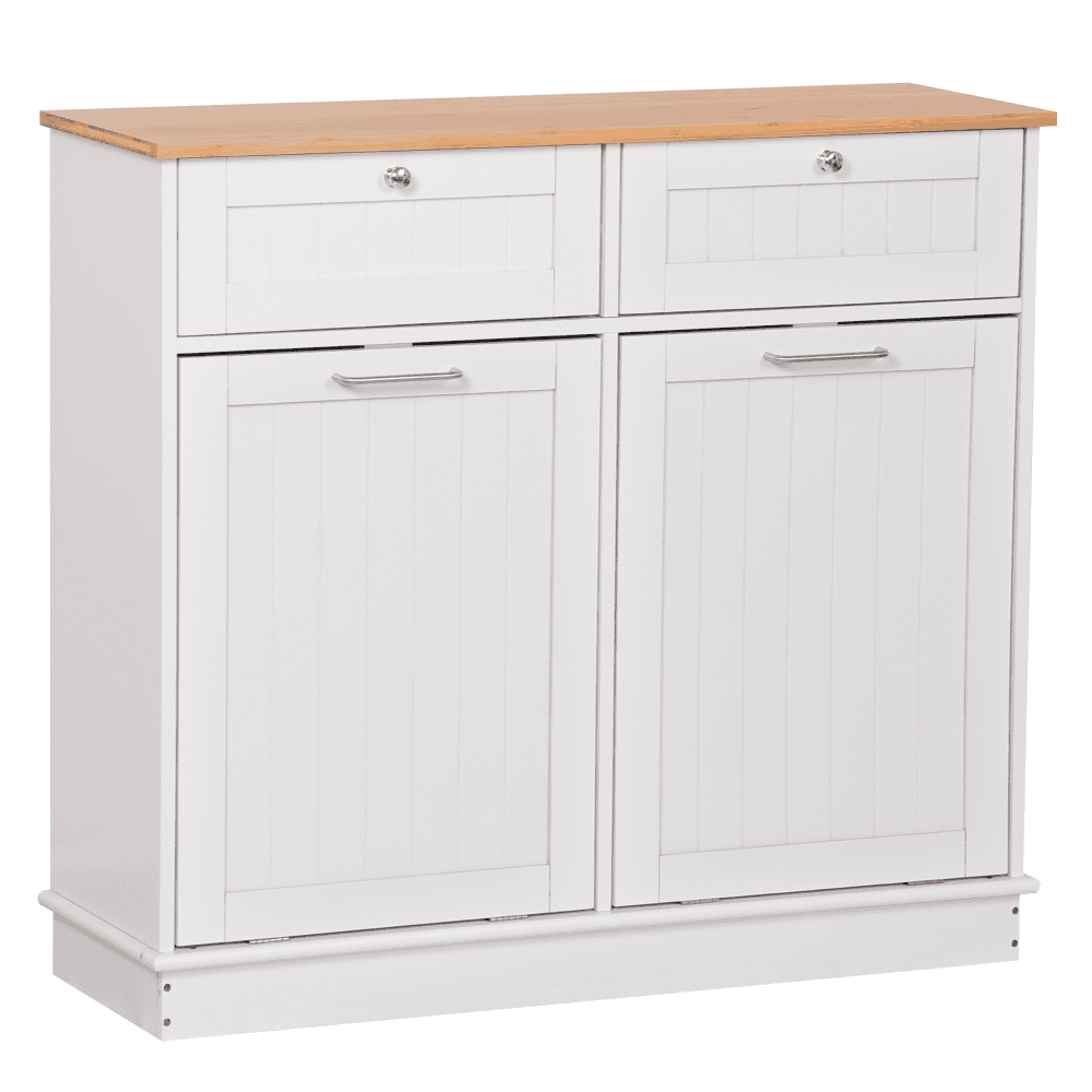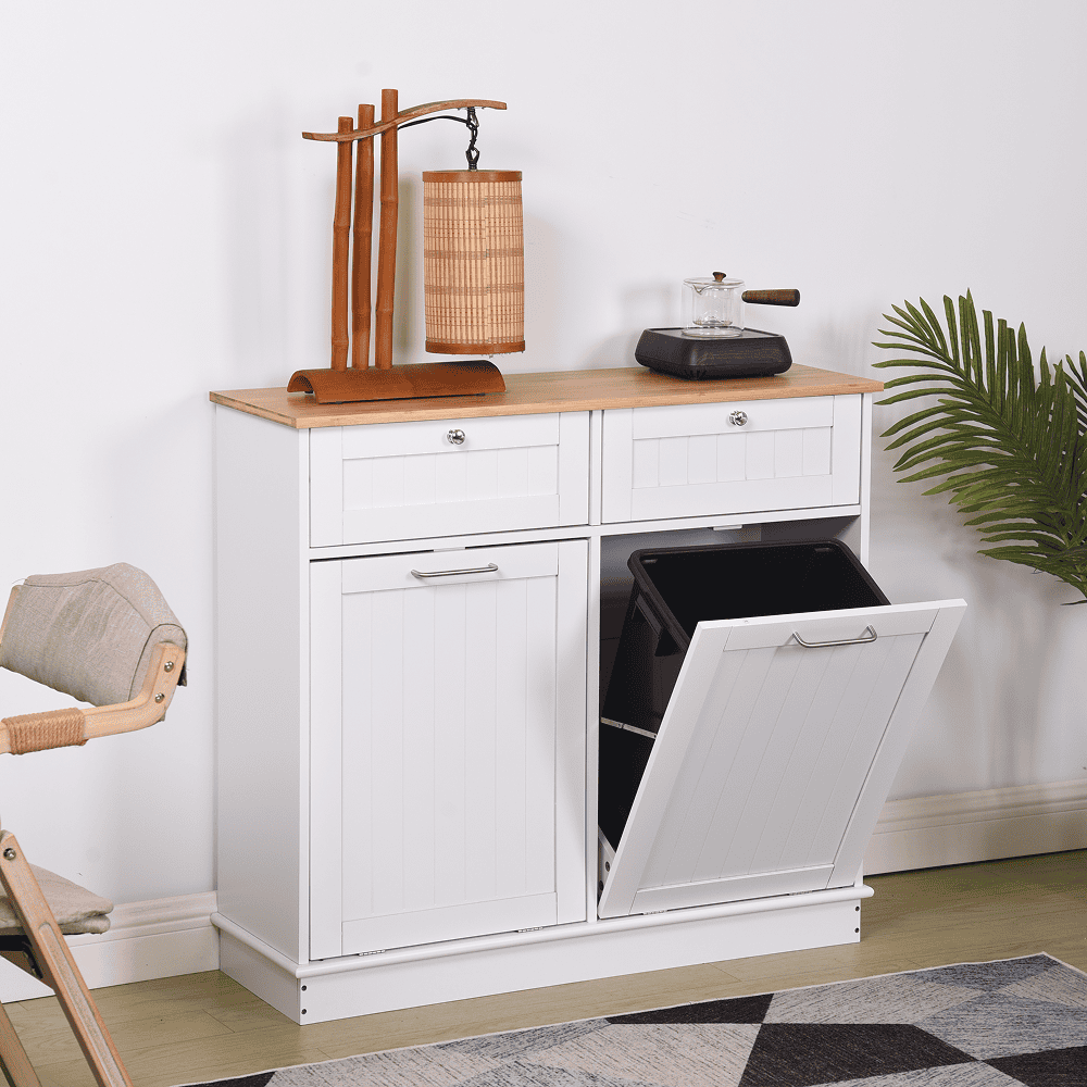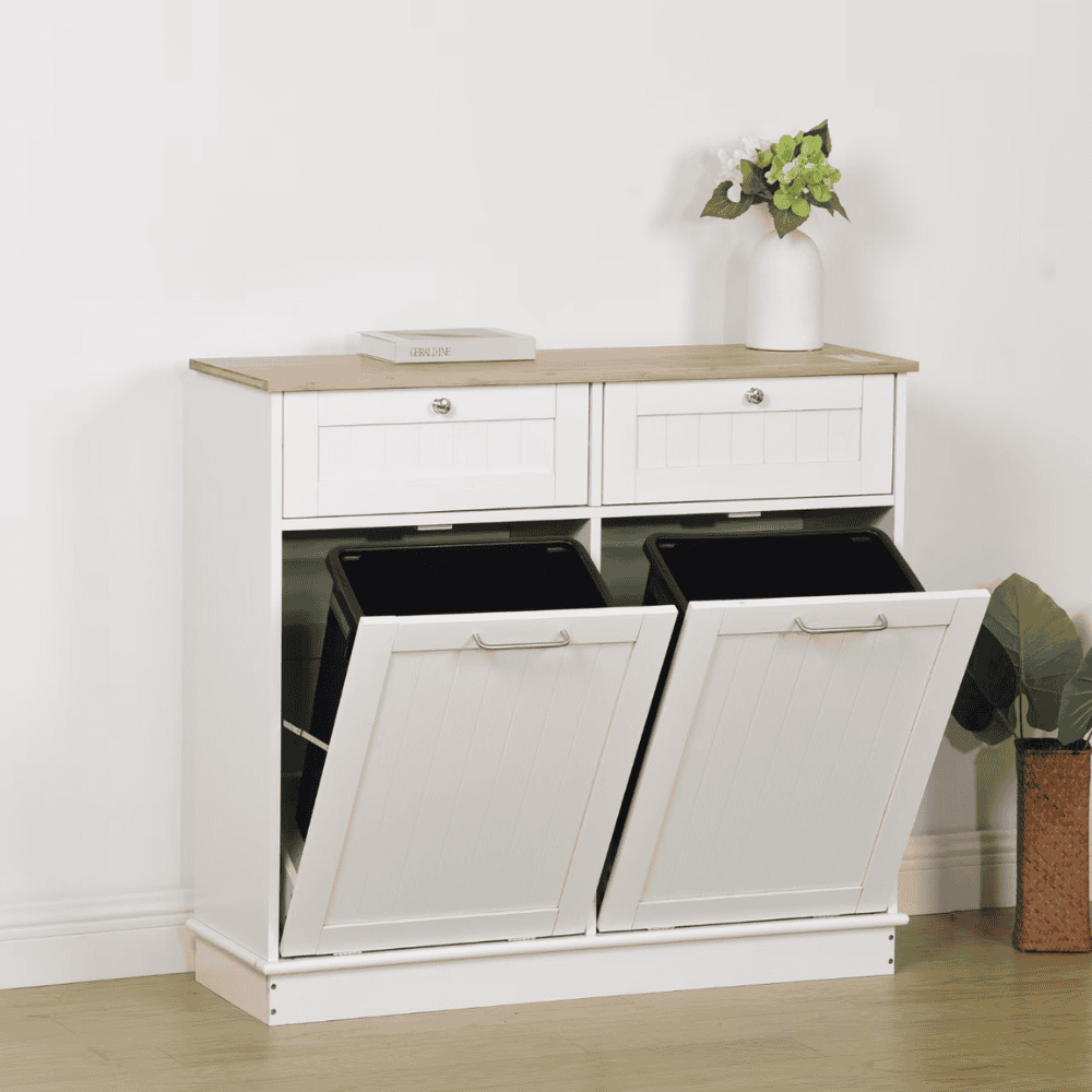 Material: MDF înfoliat/bambus lăcuit Culoare: alb/bambus natural Dimensiuni (lxAxh): 100x33x90 cm 2 Sertare Dimensiuni interioare ale sertarului (lxAxh): 43×26,8×15 cm Uşă cu deschidere batantă Se livrează cu 2 coşuri de gunoi Volum coş: 40 l Portanţă coş: 50 kg Mânere argintii Material mâner: oţel inoxidabil Ideal pentru bucătărie, baie sau ca spaţiu de depozitare pentru animale de companie Multifuncţional Livrat dezasamblat