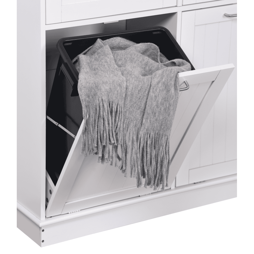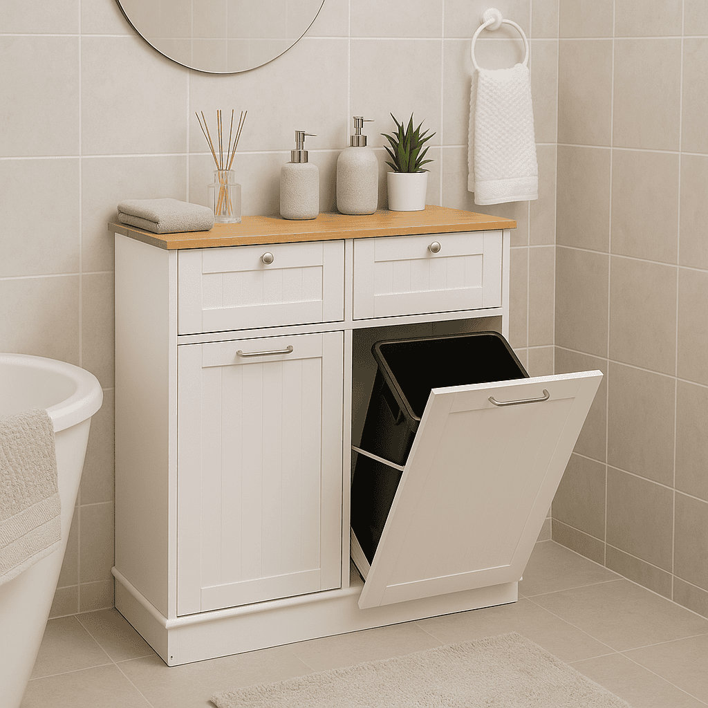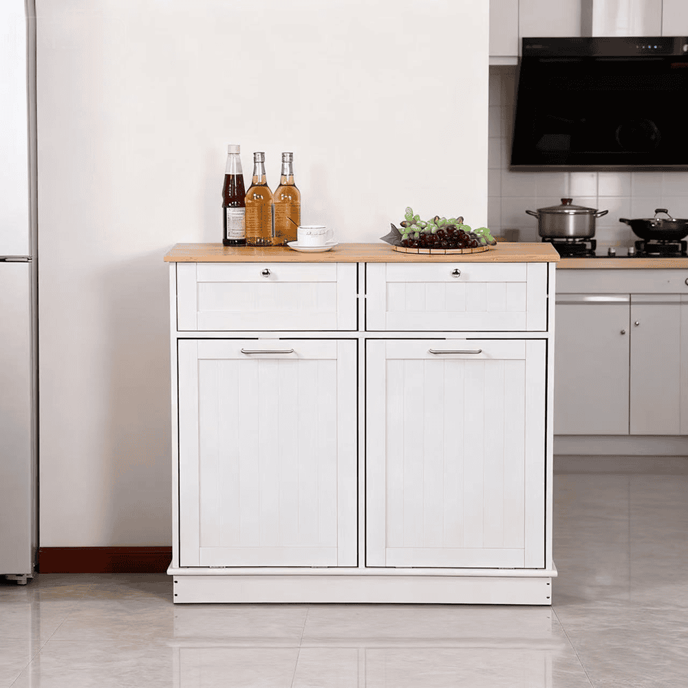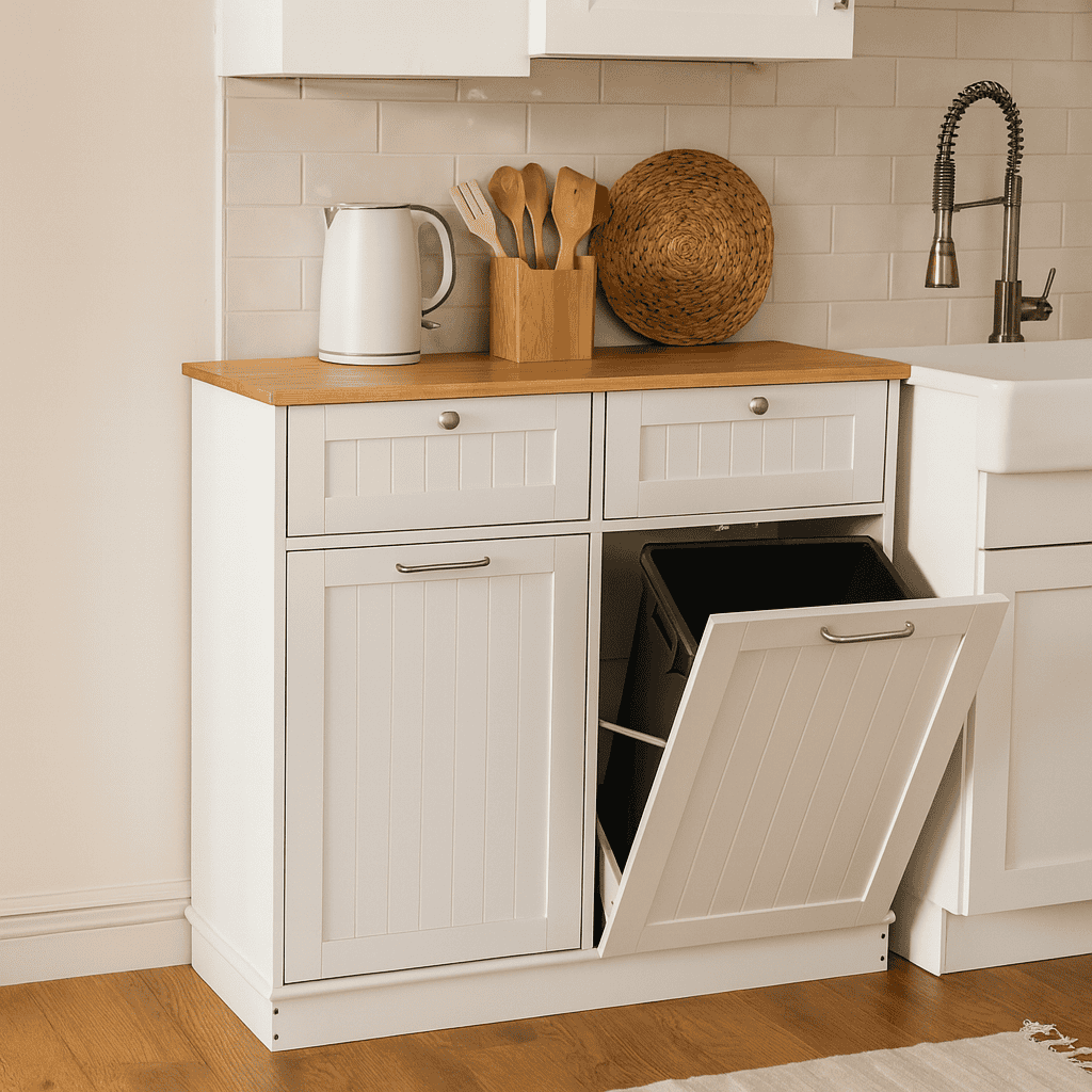 Material: MDF înfoliat/bambus lăcuit Culoare: alb/bambus natural Dimensiuni (lxAxh): 100x33x90 cm 2 Sertare Dimensiuni interioare ale sertarului (lxAxh): 43×26,8×15 cm Uşă cu deschidere batantă Se livrează cu 2 coşuri de gunoi Volum coş: 40 l Portanţă coş: 50 kg Mânere argintii Material mâner: oţel inoxidabil Ideal pentru bucătărie, baie sau ca spaţiu de depozitare pentru animale de companie Multifuncţional Livrat dezasamblat