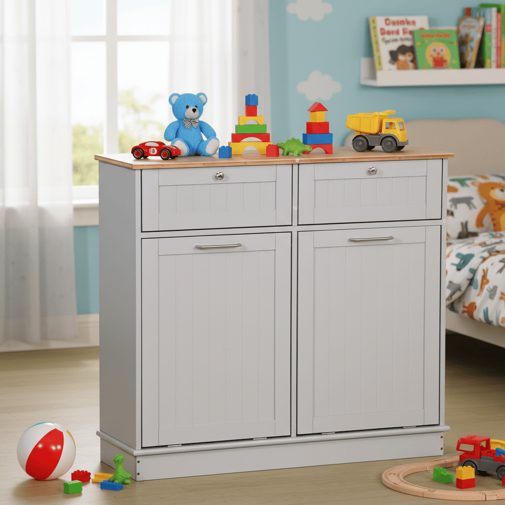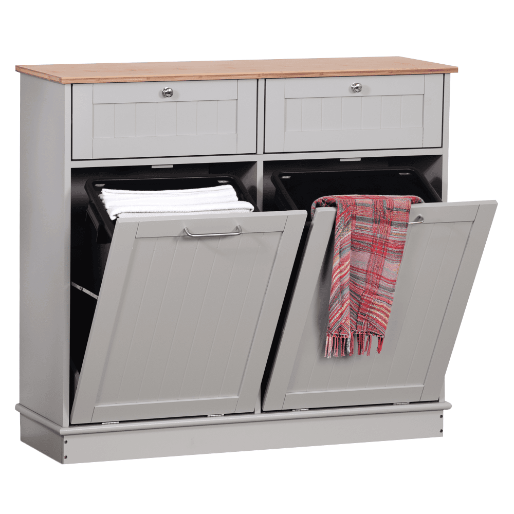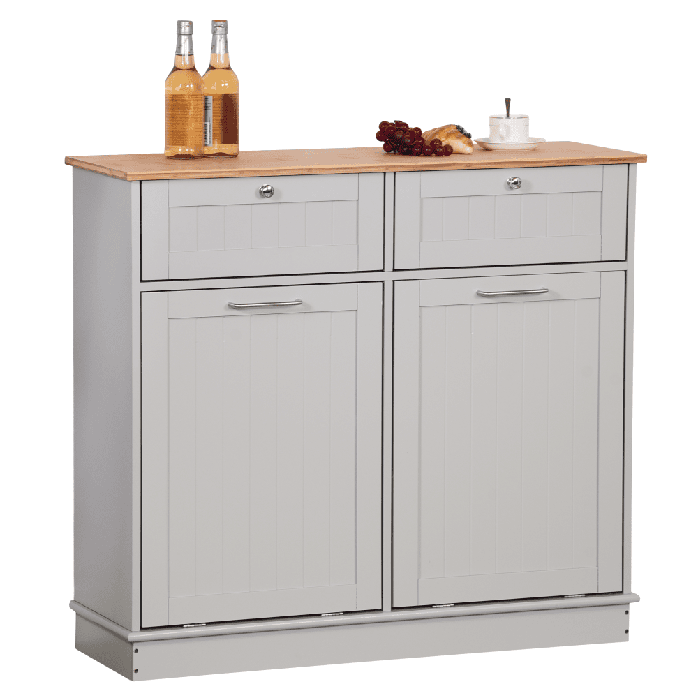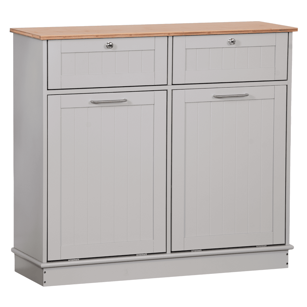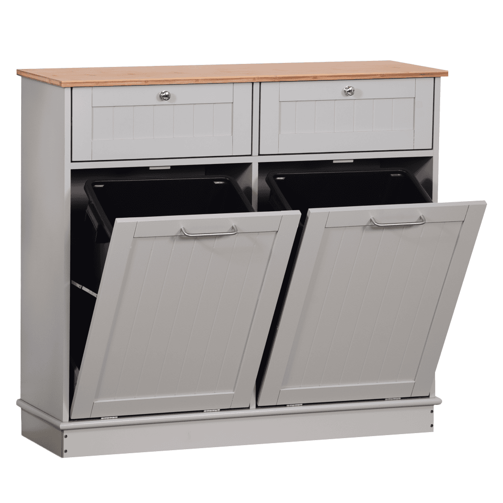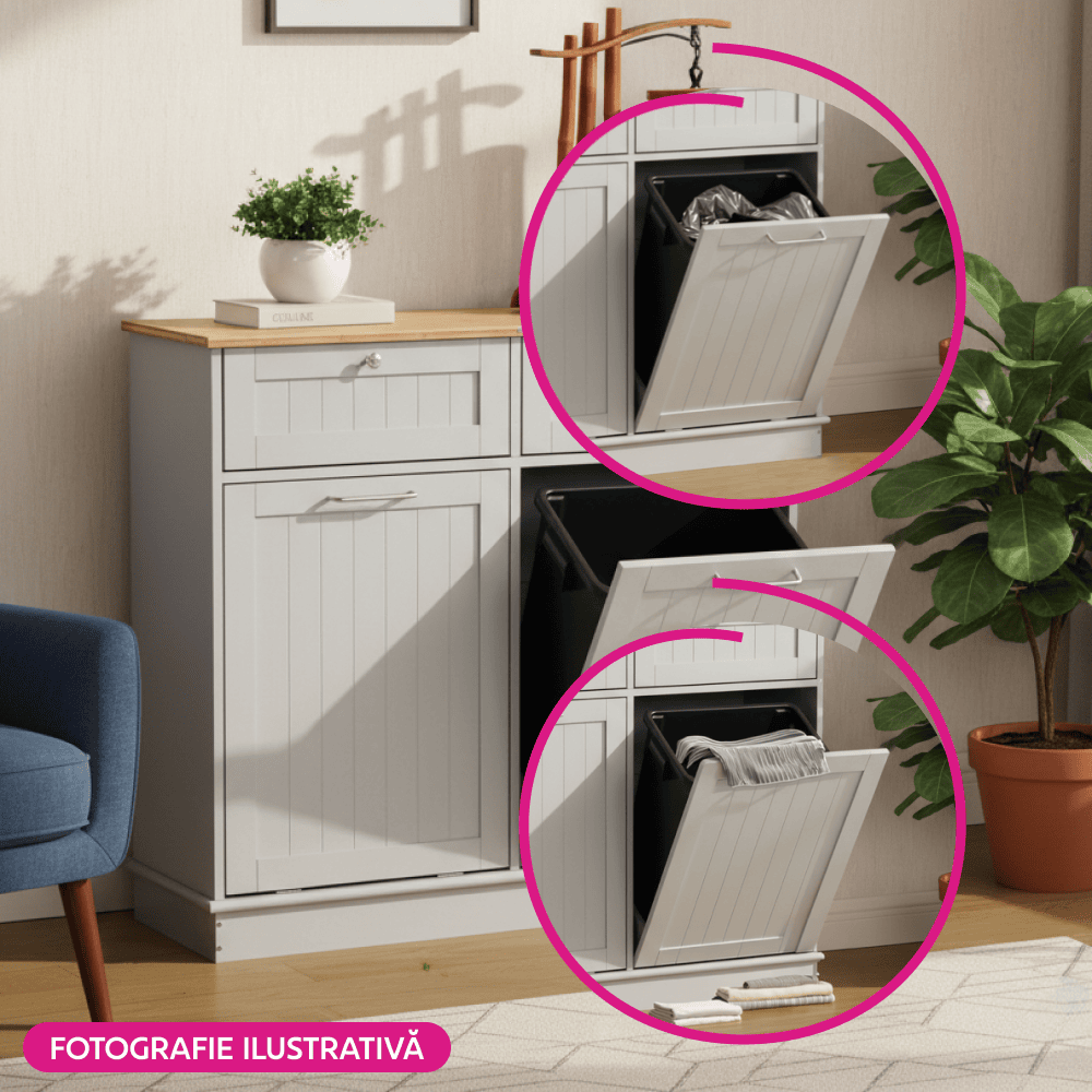 Material: MDF înfoliat/bambus lăcuit Culoare: gri/bambus natural Dimensiuni (lxAxh): 100x33x90 cm 2 Sertare Dimensiuni interioare ale sertarului (lxAxh): 43×26,8×15 cm Uşă cu deschidere batantă Se livrează cu 2 coşuri de gunoi Volum coş: 40 l Portanţă coş: 50 kg Mânere argintii Material mâner: oţel inoxidabil Ideal pentru bucătărie, baie sau ca spaţiu de depozitare pentru animale de companie Multifuncţional Livrat dezasamblat