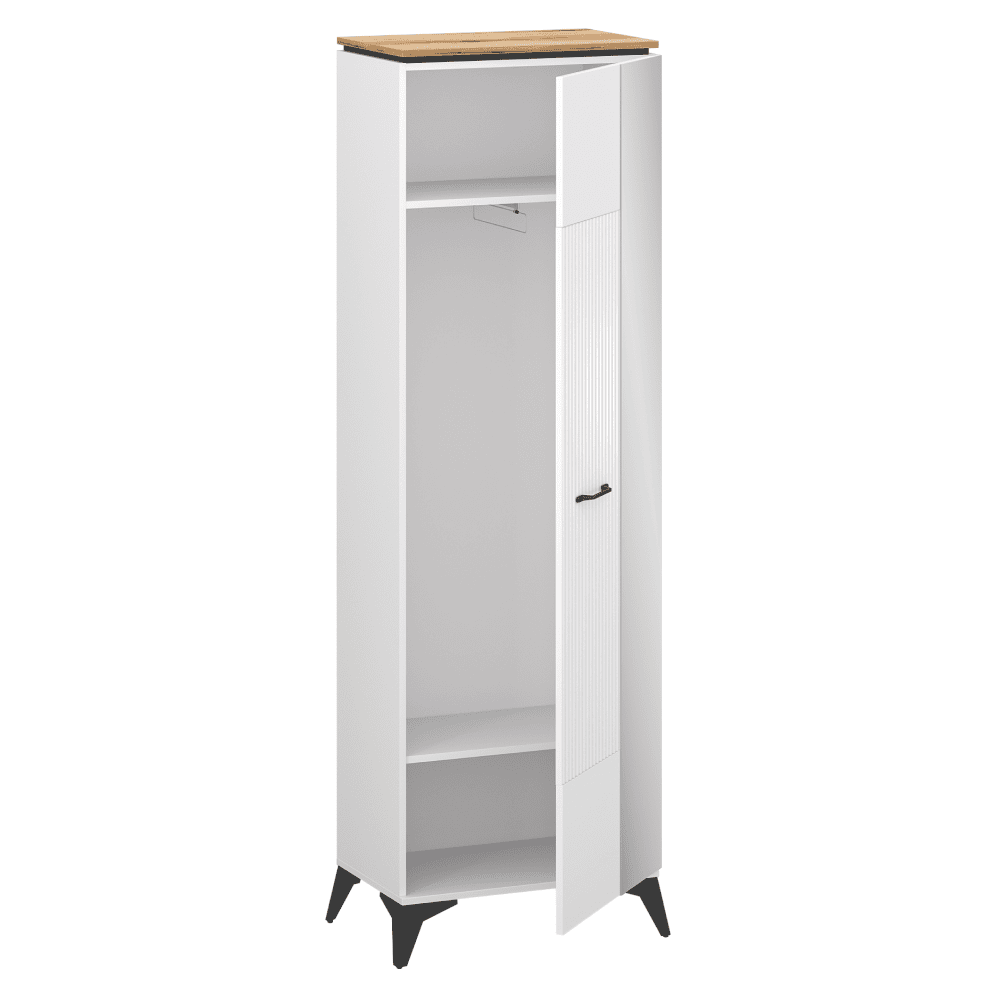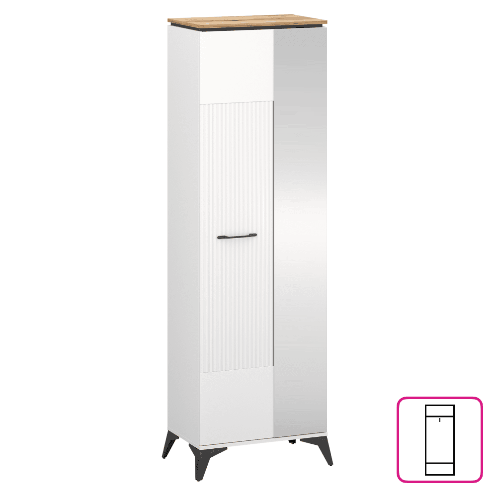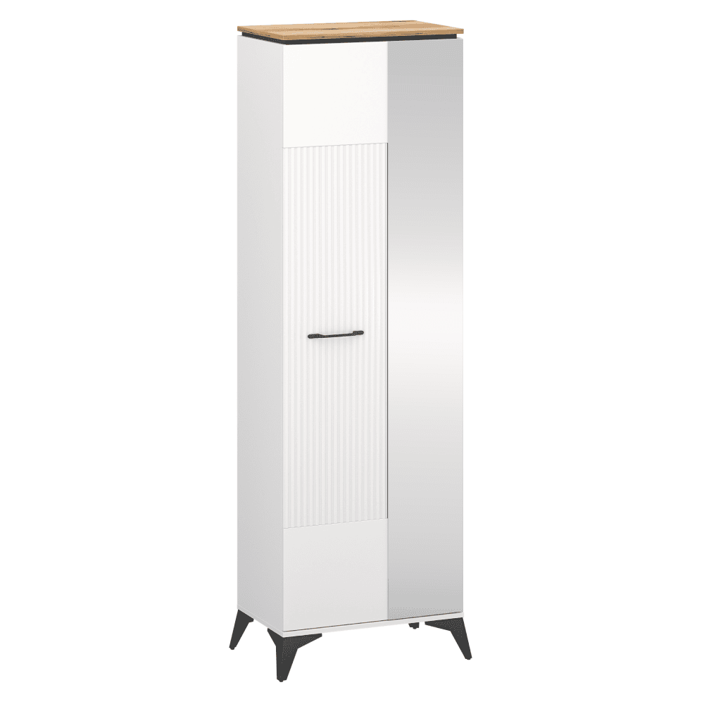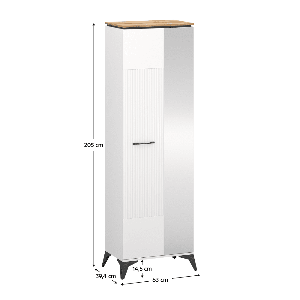 Material: DTD laminat/MDF înfoliat/PVC Culoare: alb/stejar evoke Dimensiuni (lxAxh): 63×39,4×205 cm Grosimea materialului: 1,6 cm Cu o uşă Cu oglindă Poliţă Bară de umeraşe extensibilă Portanţă poliţă: 3 kg Mânere metalice Culoare mânere: neagră Pe picioare Culoare picioare: negre Înălţime picioare: 14,5 cm Uşă frezată decorativ Design modern Recomandăm fixarea de perete Livrată dezasamblată