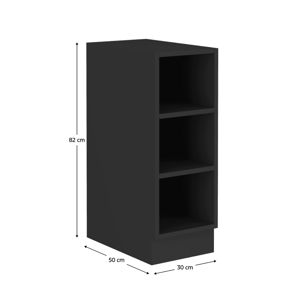 Material: DTD laminat Culoare: negru mat Dimensiuni (Lxlxh): 30x50x82 cm Grosime material: 1,6 cm Rafturi Cu şină de jos /soclu Fără blat de lucru Trebuie să cumpăraţi blatul de lucru şi să îl puneţi pe dulăpior Design modern Cu opţiunea de a cumpăra chiuveta universală LAY ON. Livrat dezasamblat Dulapurile inferioare includ şina inferioară, fără blat de lucru. Opţiunea de a achiziţiona blat de lucru din marmură roma la preţul de 379 Lei/m. Opţiunea de a achiziţiona o chiuvetă universală LAY ON.
