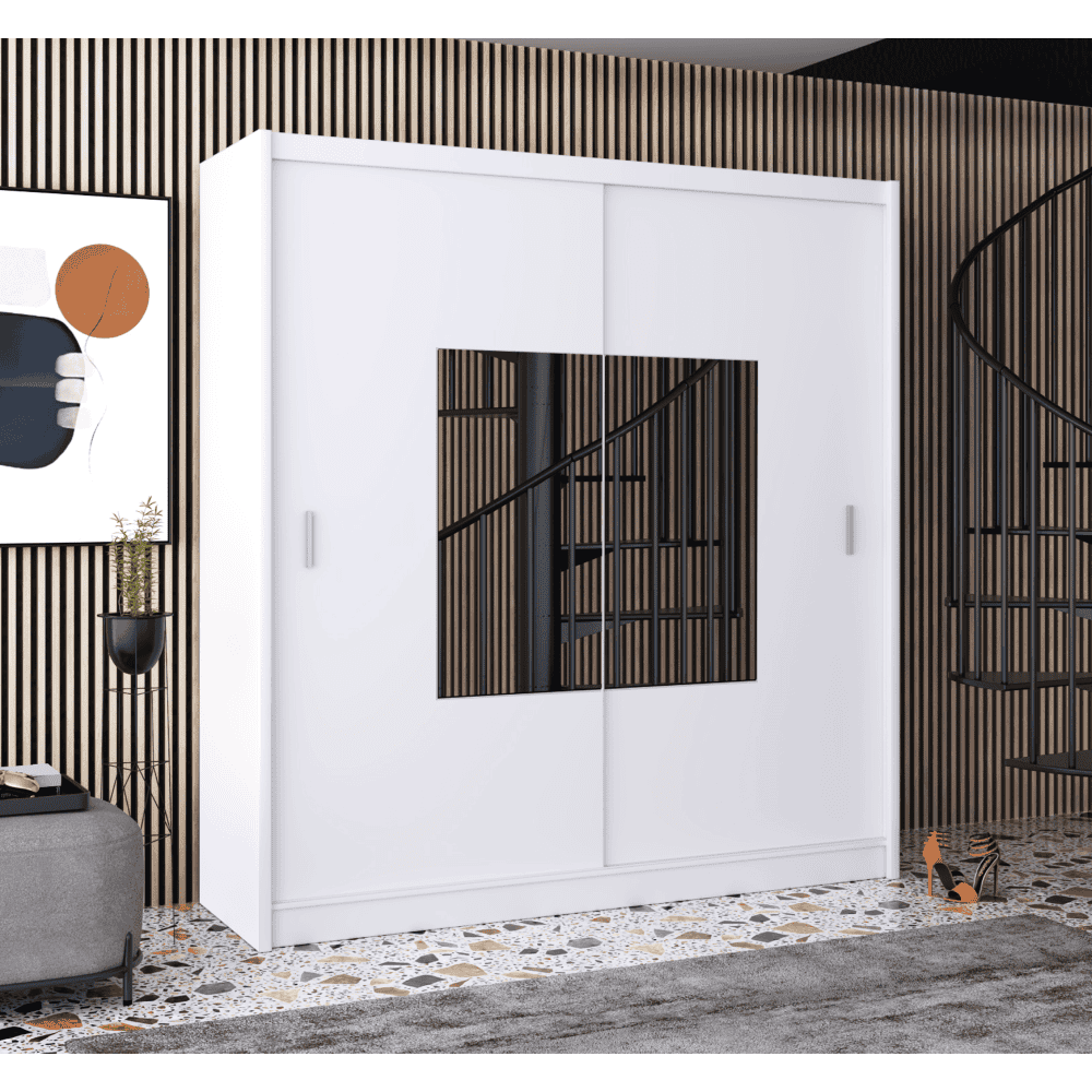 Material: PAL melaminat / margini ABS / fâşii MDF folie / sticlă Culoare: albă / stejar craft Dimensiuni (LxAxÎ): 203x61x215 cm Grosimea materialului PAL: 1,6 cm Cu mânere din plastic Culoarea mânerelor: argintie Forma mânerelor: dreptunghiulară Cu oglindă Cu două uşi Cu uşi glisante Bară pentru umeraşe Zonă cu rafturi Capacitatea de încărcare a raftului: 5 kg