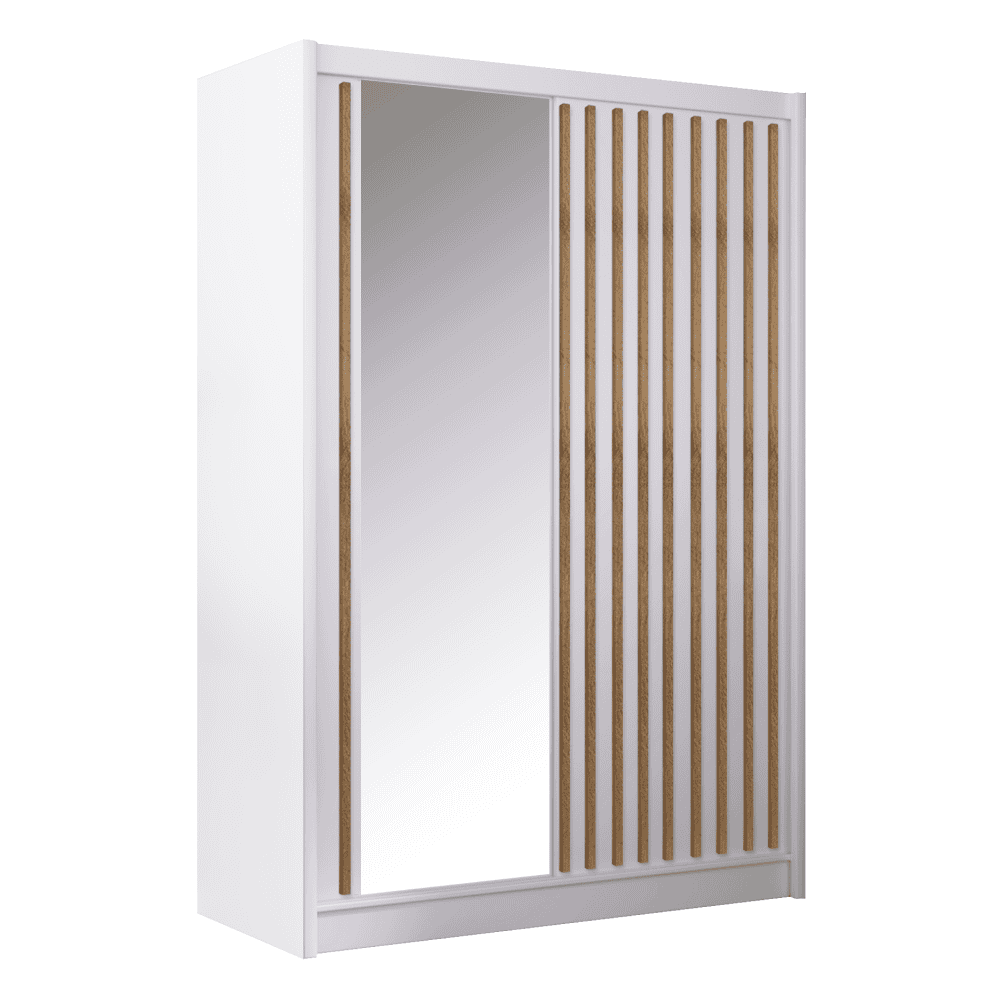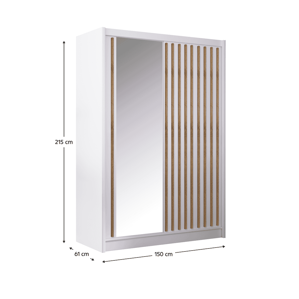 Material: PAL melaminat / margini ABS /fâşii MDF folie / sticlă Culoare: alb / stejar craft Dimensiuni (LxAxÎ): 150x61x215 cm Grosimea PAL: 1,6 cm Grosimea lamelelor: 2,5 cm Grosime ABS: 0,045 cmCapacitatea de încărcare a raftului: 5 kg