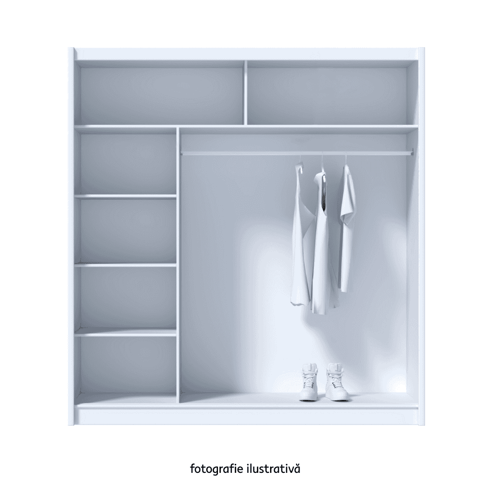 Capacitatea de încărcare a cuierului: 5 kg Cu uşi glisante Cu mânere Cu oglindă Zonă cu rafturi Bară pentru umeraşe Uşă dublă Nu este indicat să împovăraţi blatul superior Livrat dezasamblat