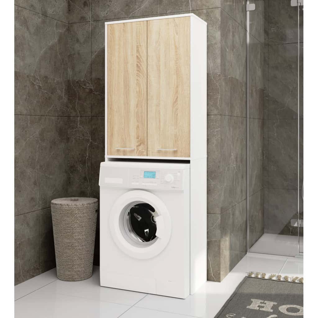 Dulap de baie cu 2 usi si 4 rafturi, pentru spatiul de deasupra masinii de spalat, 64x30x180 cm, alb si stejar sonoma Mob360