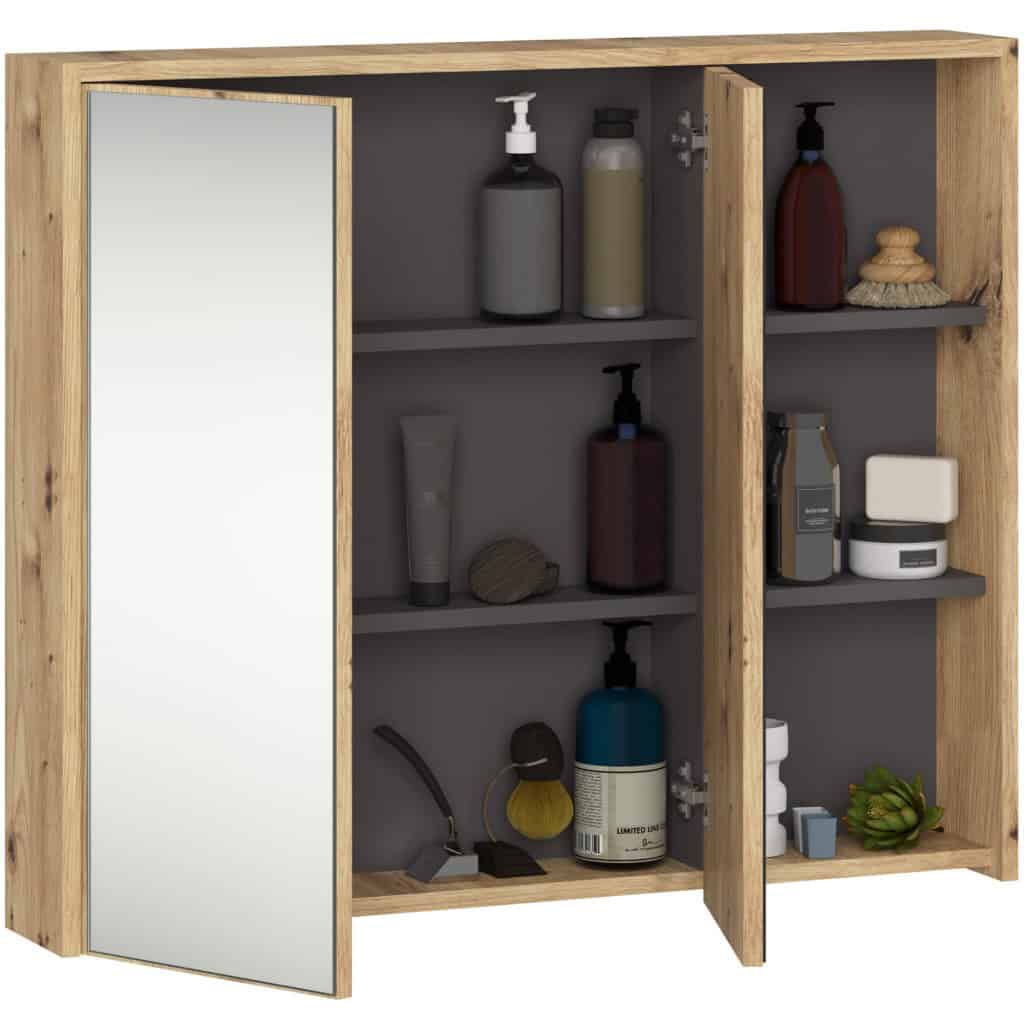 Dulap de baie suspendat cu oglinda, 2 usi si 3 rafturi interioare, PAL 16 mm, 90x15x75 cm, stejar artisan si gri Mob360 – produs disponibil în magazinul Mob360.